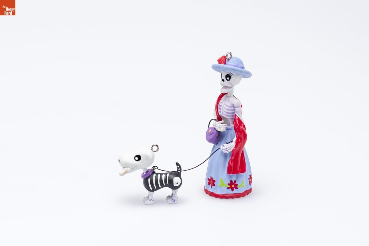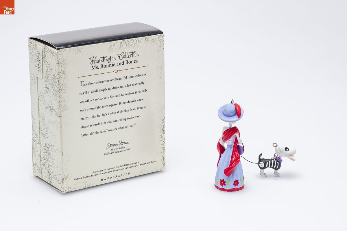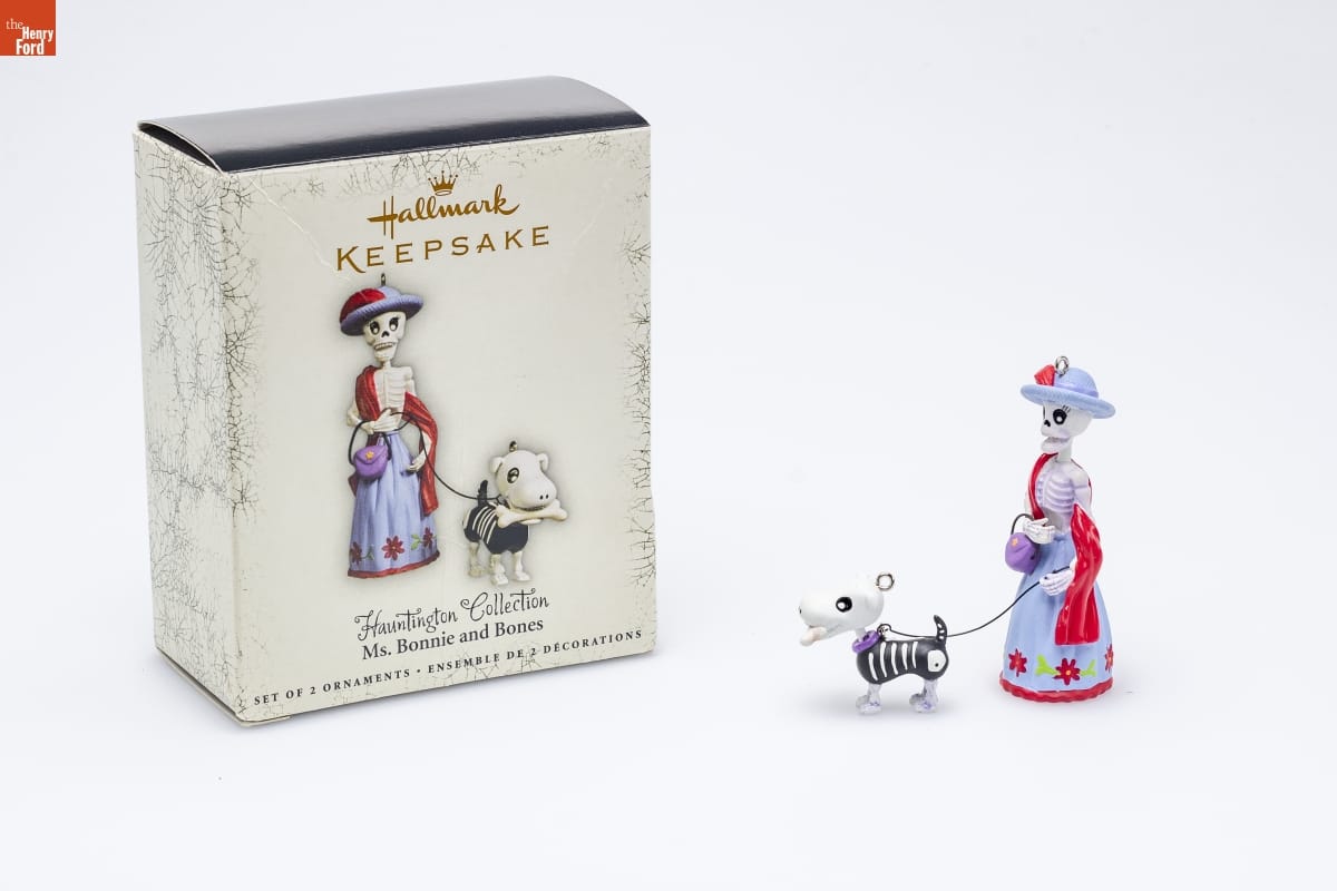 Hallmark has created Halloween ornaments since the early 2000s. The company produced a series of Halloween ornaments for its Hauntington Collection in 2005. Building displays depicting the town of Hauntington became backdrops for ornaments like this one of Ms. Bonnie and her dog Bones. The collection celebrated the fun--and creepy--spirit of Halloween.