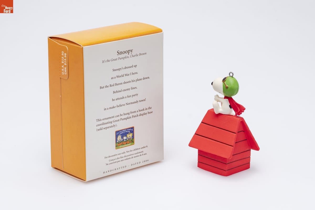 Snoopy / It's the Great Pumpkin, Charlie Brown / Snoopy's dressed up / as a World War I hero. / But the Red Baron shoots his plane down. / Behind enemy lines, / he attends a fun party / in a make-believe Normandy town! / This ornament can be hung from a hook in the / coordinating Great Pumpkin Patch display base / (sold separately). / IT'S THE GREAT PUMPKIN, / CHARLIE BROWN / 40TH ANNIVERSARY / For decorative use only. Not for children under 8. / Concu a des fins decoratives seulement. / Ne convient pas aux enfants de moins de 8 ans. / HANDCRAFTED - DATED 2006