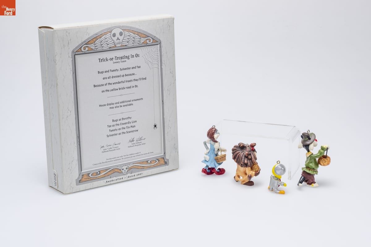 Trick-or-Treating in Oz / Looney Tunes / Bugs and Tweey, Sylvester and Taz / are all dressed up because... / Because of the wonderful treats they'll find / on the yellow brick road in Oz. / House display and additional ornaments / may also be available. / Bugs as Dorothy / Taz as the Cowardly Lion / Tweety as the Tin Man / Sylvester as the Scarecrow / John "Collin" Francis / Hallmark Keepsake Artist / Nello Williams / Hallmark Keepsake Artist / For decorative use only. Not for children under 8. / Concu a des fins decoratives seulement. Ne convient pas aux enfants de moins de 8 ans. / handcrafted - dated 2007