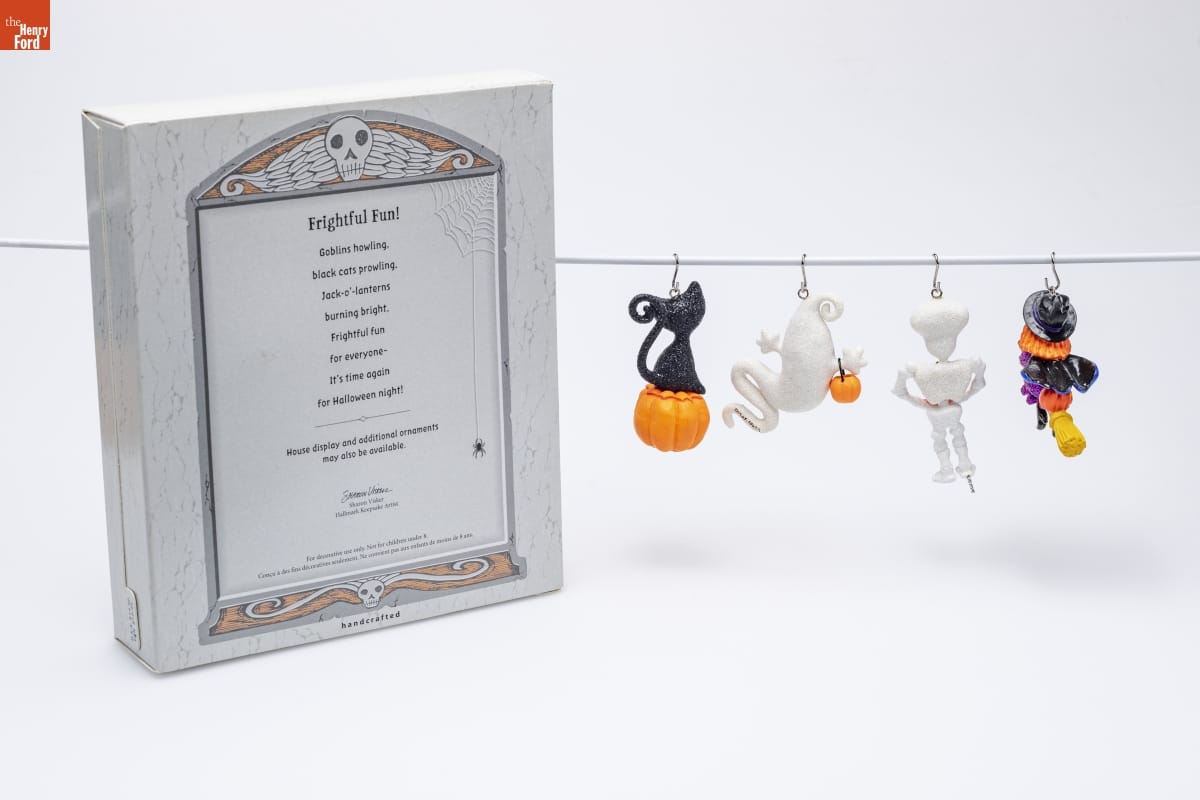 Frightful Fun! / Goblins howling, / black cats prowling, / Jack-o'lanterns / burning bright. / Frightful fun / for everyone- / It's time again / for Halloween night! / House display and additional ornaments / may also be available. / Sharon Visker / Hallmark Keepsake Artist / For decorative use only. Not for children under 8. / Concu a des fins decoratives seulement. Ne convient pas aux enfants de moins de 8 ans. / handcrafted