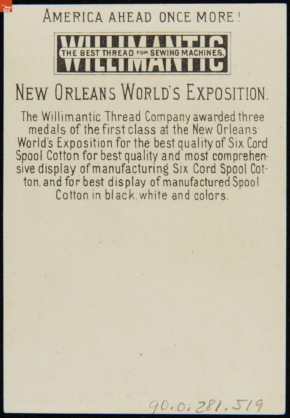 Trade Card for Spool Cotton, Willimantic Linen Co., circa 1881