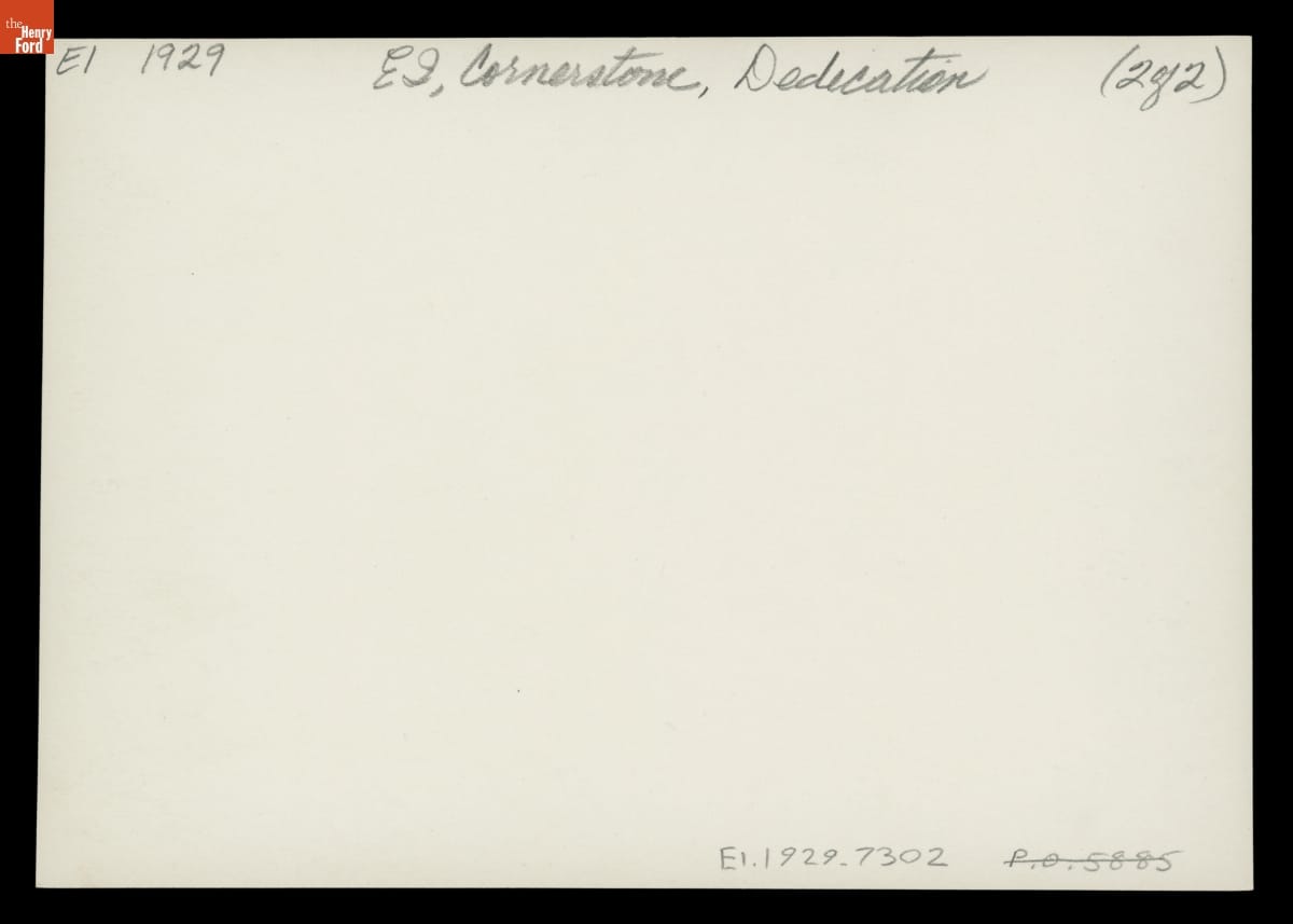September 27th, 1928, on the future site of Henry Ford's new museum, famed inventor Thomas Edison placed a spade once used by legendary horticulturist Luther Burbank into a block of freshly poured Portland cement. Ford looked on as his friend and personal hero wrote his name in the wet cement, officially dedicating Henry Ford Museum--where this "cornerstone" is now displayed.