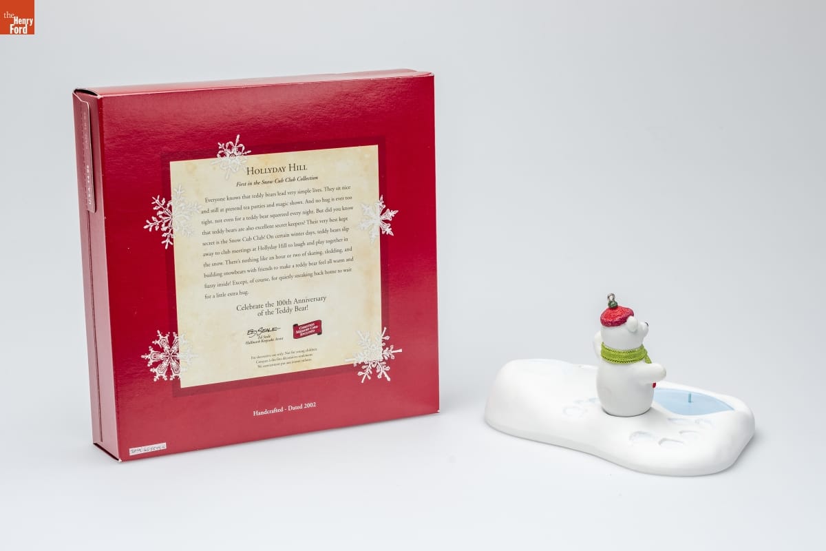 HOLLYDAY HILL / First in the Snow Cub Club Collection / Everyone knows that teddy bears lead very simple lives. They sit nice / and still at pretend tea parties and magic shows. And no hug is ever too / tight, not even for a teddy bear squeezed every night. But did you know / that teddy bears are also excellent secret keepers? Their very best kept / secret is the Snow Cub Club! On certain winter days, teddy bears slip / away to club meetings at Hollyday Hill to laugh and play together in / the snow. There's nothing like an hour or two of skating, sledding, and / building snowbears with friends to make a teddy bear feel all warm and / fuzzy inside! Except, of course, for quietly sneaking back home to wait / for a little extra hug. / Celebrate the 100th Anniversary / of the Teddy Bear! / Ed Seale / Hallmark Keepsake Artist / CHRISTMAS / MEMORY CARD / ENCLOSED / For decorative use only. Not for young children. / Concue a des fins decoratives seulement. / Ne convient pas aux jeanes enfants. / Handcrafted - Dated 2002