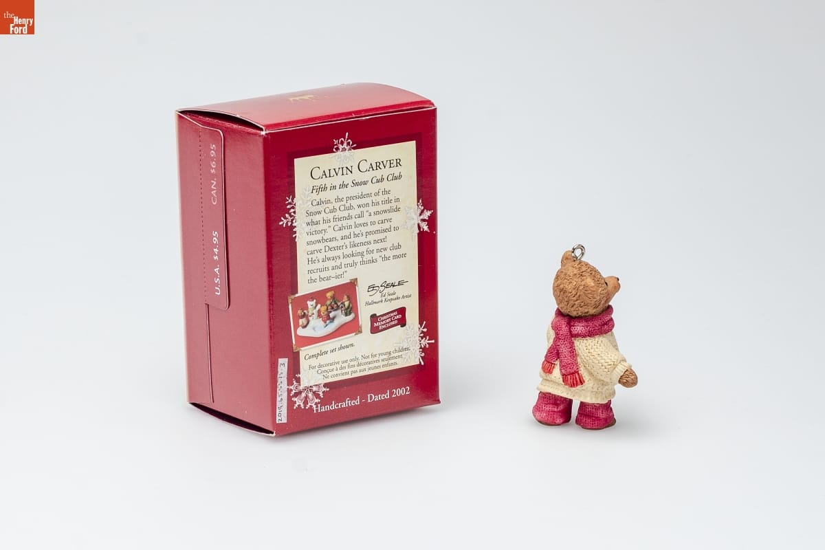 CALVIN CARVER / Fifth in the Snow Cub Club / Calvin, the president of the / Snow Cub Club, won his title in / what his friends call "a snowslide / victory." Calvin loves to carve / snowbears, and he's promised to / carve Dexter's likeness next! / He's always looking for new club / recruits and truly thinks "the more / the bear-ier!" / Ed Seale / Hallmark Keepsake Artist / CHRISTMAS / MEMORY CARD / ENCLOSED / Complete set shown. / For decorative use only. Not for young children. / Concue a des fins decoratives seulement. / Ne convient pas aux jeanes enfants. / Handcrafted - Dated 2002