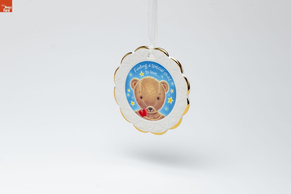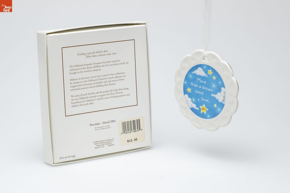 Finding a special child to love ... / More than a dream come true ... / This Hallmark Keepsake Ornament has been created in / celebration of the dreams fulfilled, the lives enriched, and the joy / brought to the world by adoption. / Millions of television viewers have joined in that celebration / by tuning in to the Hallmark Channel to watch Adoption - an / original series featuring real families and real stories of their / emotional journeys toward fulfilling their dreams. / We salute all such families and the people who help them along / the way. Hallmark is proud to support the Dave Thomas / Foundation for Adoption [TM] and the cause of helping parents and / children find each other. / Porcelain - Dated 2002 / (C) 2002 Hallmark Licensing, Inc. / Mfd. for Hallmark Cards, Inc. / Kansas City, MO 64141 / Made in U.S.A. QHB4253