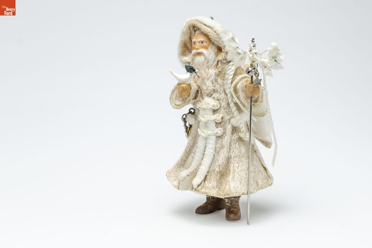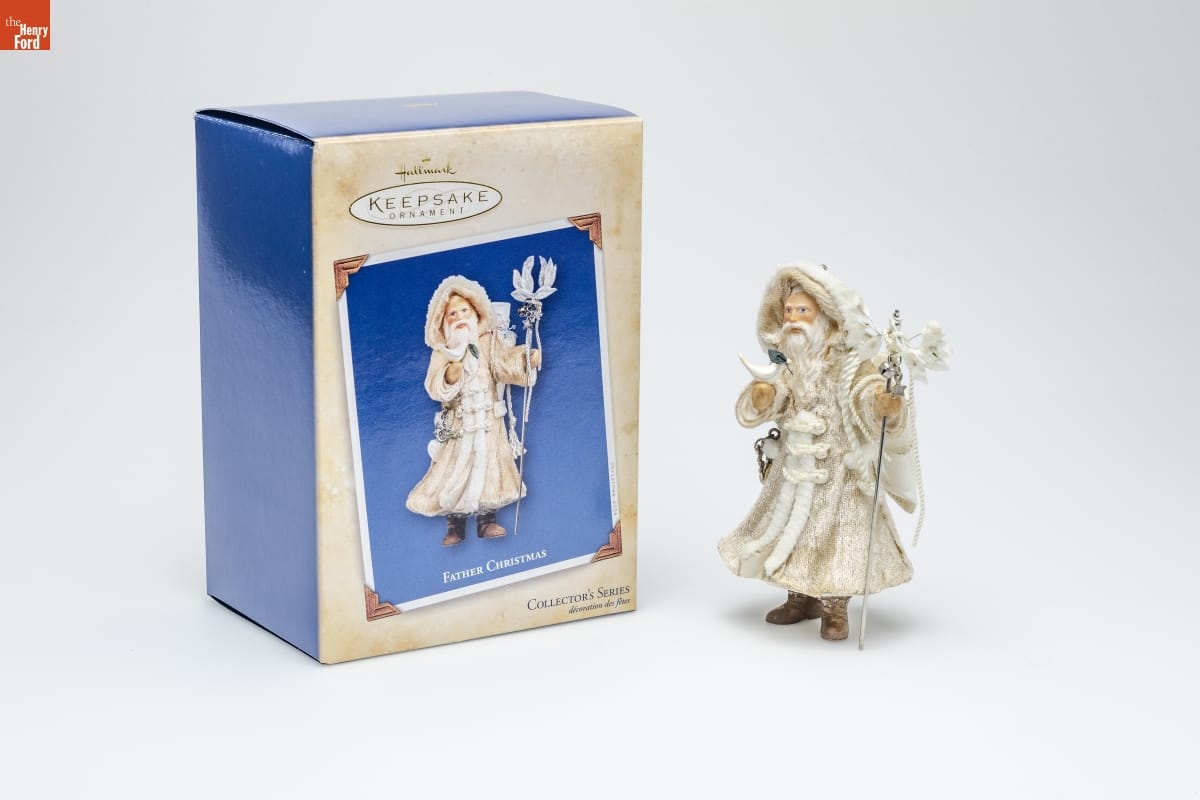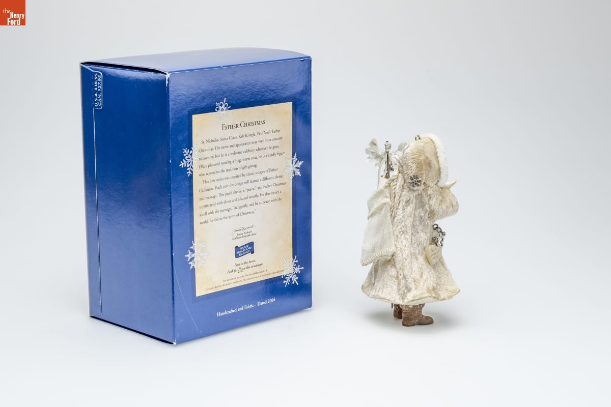 FATHER CHRISTMAS / St. Nicholas. Santa Claus. Kris Kringle. Pere Noel. Father / Christmas. His name and appearance may vary from country / to country, but he is a welcome celebrity wherever he goes. / Often pictured wearing a long, warm coat, he is a kindly figure / who represents the tradition of gift-giving. / This new series was inspired by classic images of Father / Christmas. Each year the design will feature a different theme / and message. This year's theme is "peace," and Father Christmas / is portrayed with doves and a laurel wreath. He also carries a / scroll with the message, "Act gently, and be at peace with the / world, for this is the spirit of Christmas." / Joanne Eschrich / Hallmark Keepsake Artist / HOLIDAY / MEMORY CARD / ENCLOSED / First in the Series / Look for 1 on this ornament. / For decorative use only. Not for children under 8. / Concue a des fins decoratives seulement. Ne convient pas aux enfants de moins de 8 ans. / Handcrafted and Fabric - Dated 2004