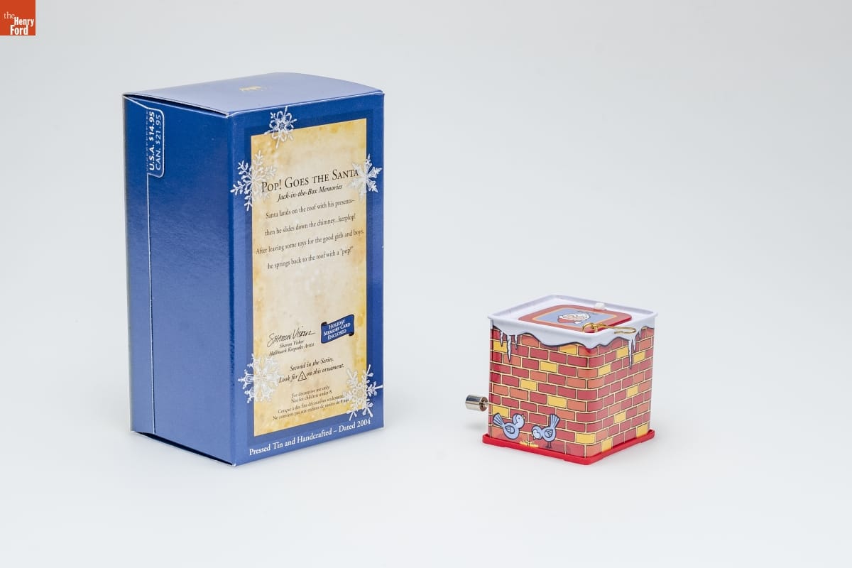 POP! GOES THE SANTA / Jack-in-the-Box Memories / Santa lands on the roof with his presents-- / then he slides down the chimney...kerplop! / After leaving some toys for the good girls and boys, / he springs back to the roof with a "pop!" / Sharon Visker / Hallmark Keepsake Artist / HOLIDAY / MEMORY CARD / ENCLOSED / Second in the Series / Look for 2 on this ornament. / For decorative use only. / Not for children under 8. / Concue a des fins decoratives seulement. / Ne convient pas aux enfants de moins de 8 ans. / Pressed Tin and Handcrafted - Dated 2004