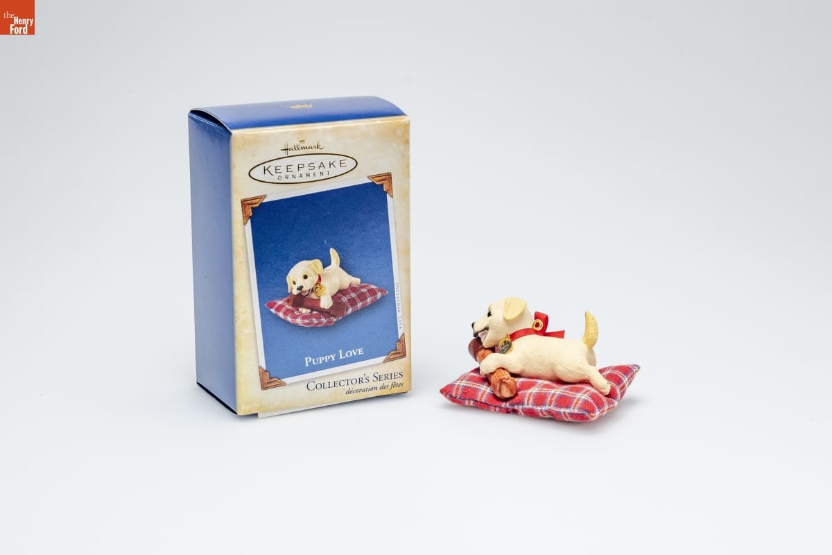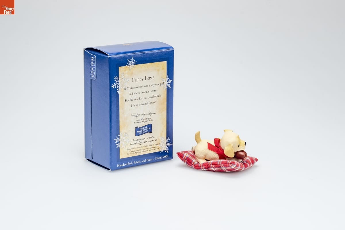 PUPPY LOVE / His Christmas bone was neatly wrapped / and placed beneath the tree. / But this cute Lab just couldn't wait, / "I think this one's for me!" / Anita Marra Rogers / Hallmark Keepsake Artist / HOLIDAY / MEMORY CARD / ENCLOSED / Fourteenth in the Series. / Look for 14 on this ornament. / For decorative use only. Not for children under 8. / Concue a des fins decoratives seulement. / Ne convient pas aux enfants de moins de 8 ans. / Handcrafted, Fabric and Brass - Dated 2004