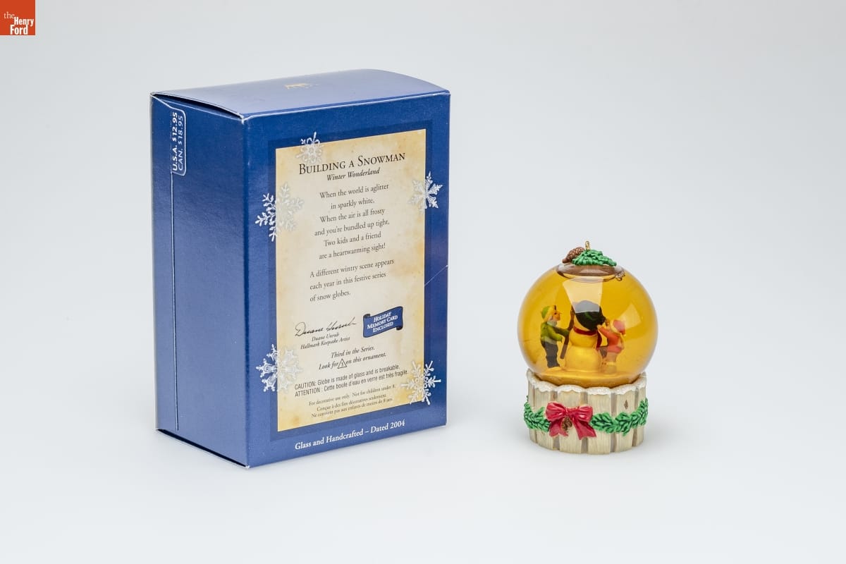 BUILDING A SNOWMAN / Winter Wonderland / When the world is aglitter / in sparkly white, / When the air is all frosty / and you're bundled up tight, / Two kids and a friend / are a heartwarming sight! / A different wintry scene appears / each year in this festive series / of snow globes. / Duane Unruh / Hallmark Keepsake Artist / HOLIDAY / MEMORY CARD / ENCLOSED / Third in the Series / Look for 3 on this ornament. / CAUTION: Globe is made of glass and is breakable. / ATTENTION: Cette boule d'eau en verre est tres fragile. / For decorative use only. Not for children under 8. / Concue a des fins decoratives seulement. / Ne convient pas aux enfants de moins de 8 ans. / Glass and Handcrafted - Dated 2004