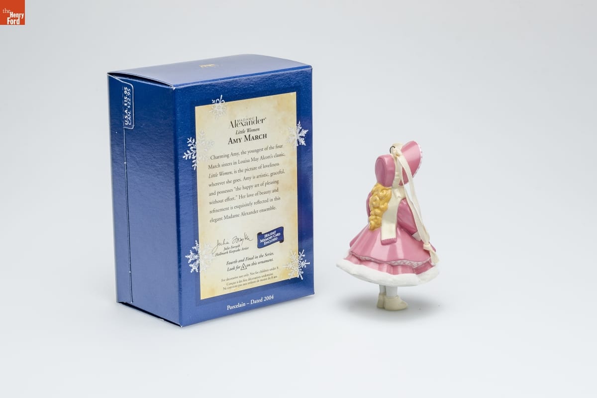 MADAME / Alexander(R) / Little Women / AMY MARCH / Charming Amy, the youngest of the four / March sisters in Louisa May Alcott's classic, / Little Women, is the picture of loveliness / wherever she goes. Amy is artistic, graceful, / and possesses "the happy art of pleasing / without effort." Her love of beauty and refinement is exquisitely reflected in this / elegant Madame Alexander ensemble. / Julie Forsyth / Hallmark Keepsake Artist / HOLIDAY / MEMORY CARD / ENCLOSED / Fourth and Final in the Series. / Look for 4 on this ornament. / For decorative use only. Not for children under 8. / Concue a des fins decoratives seulement. / Ne convient pas aux enfants de moins de 8 ans. / Porcelain - Dated 2004