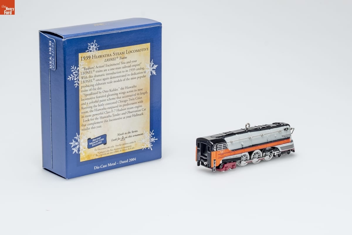 on front of ornament: THE MILWAUKEE ROAD on sides of ornament: 101 / 101 / F-7 / LIONEL(R) on bottom of ornament: 2004 / LIONEL(R) Licensed by Lionel L.L.C. / Hallmark Cards, Inc. 9 on front of packaging: Hallmark / KEEPSAKE / ORNAMENT / L / LIONEL(R) / Christmas 2004 / 1939 HIAWATHA / STEAM LOCOMOTIVE / LIONEL(R) Trains / COLLECTOR'S SERIES / decoration des fetes on back of packaging: 1939 HIAWATHA STEAM LOCOMOTIVE / LIONEL(R) Trains / "Realism! Action! Excitement! You and your / LIONEL(R) trains are a one-man railroad empire!" / With this dramatic introduction to its 1939 catalog, / LIONEL(R) once again demonstrated its dedication to / producing elaborate scale models of the most popular / trains of the day. / "Speedlined by Otto Kuhler," the Hiawatha / locomotive featured gleaming wings across its nose / and a colorful paint scheme that accentuated its length. / Running the hotly contested Chicago-Twin Cities / route, the Hiawatha outpaced its predecessors with / its more powerful Class F-7 Hudson steam engine. / Look for the Hiawatha Tender and Observation Car / that complement this locomotive at your Hallmark / retailer this year. / HOLIDAY / MEMORY CARD / ENCLOSED / Ninth in the Series. / Look for 9 on this ornament. / For decorative use only. Not for children under 8. / Concue a des fins decoratives seulement. / Ne convient pas aux enfants de moins de 8 ans. / Die-Cast Metal - Dated 2004 on bottom of packaging: LIONEL(R) Licensed by Lionel L.L.C. / Mfd. for Hallmark Cards, Inc., Kansas City, MO 64141 / Made in China QX8454