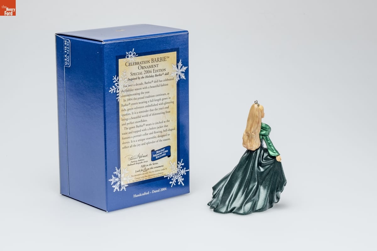 CELEBRATION BARBIE TM ORNAMENT / SPECIAL 2004 EDITION / Inspired by the Holiday Barbie(R) doll / For over a decade, Barbie(R) doll has celebrated / the holiday season with a beautiful fashion / commemorating the year. / In 2004 the proud tradition continues, as / Barbie(R) enters wearing a full-length gown in / rich, green velveteen embellished with glittering / sparkles. It is a reminder that the year's end / brings a beautiful world of shimmering frost / and perfect snowflakes. / The gown Barbie(R) wears is cinched at the / waist and topped with a bolero jacket that / features a portrait collar and flowing, bell-shaped / sleeves. It is a unique ensemble, designed to / reflect all the joy and splendor of the season. / Patricia Andrews / Hallmark Keepsake Artist / HOLIDAY / MEMORY CARD / ENCLOSED / Fifth in the Series. / Look for 5 on this ornament. / For decorative use only. Not for children under 8. / Concue a des fins decoratives seulement. / Ne convient pas aux enfants de moins de 8 ans. / Handcrafted - Dated 2004