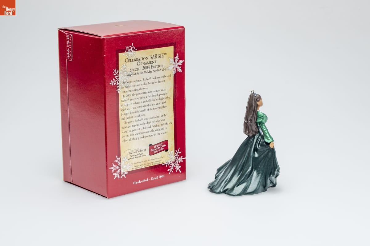 CELEBRATION BARBIE TM / ORNAMENT / SPECIAL 2004 EDITION / Inspired by the Holiday Barbie(R) doll / For over a decade, Barbie(R) doll has celebrated / the holiday season with a beautiful fashion / commemorating the year. / In 2004 the proud tradition continues, as / Barbie(R) enters wearing a full-length gown in / rich, green velveteen embellished with glittering / sparkles. It is a reminder that the year's end / brings a beautiful world of shimmering frost / and perfect snowflakes. / The gown Barbie(R) wears is cinched at the / waist and topped with a bolero jacket that / features a portrait collar and flowing, bell-shaped / sleeves. It is a unique ensemble, designed to / reflect all the joy and splendor of the season. / Patricia Andrews / Hallmark Keepsake Artist / HOLIDAY / MEMORY CARD / ENCLOSED / For decorative use only. Not for children under 8. / Concue a des fins decoratives seulement. / Ne convient pas aux enfants de moins de 8 ans. / Handcrafted - Dated 2004