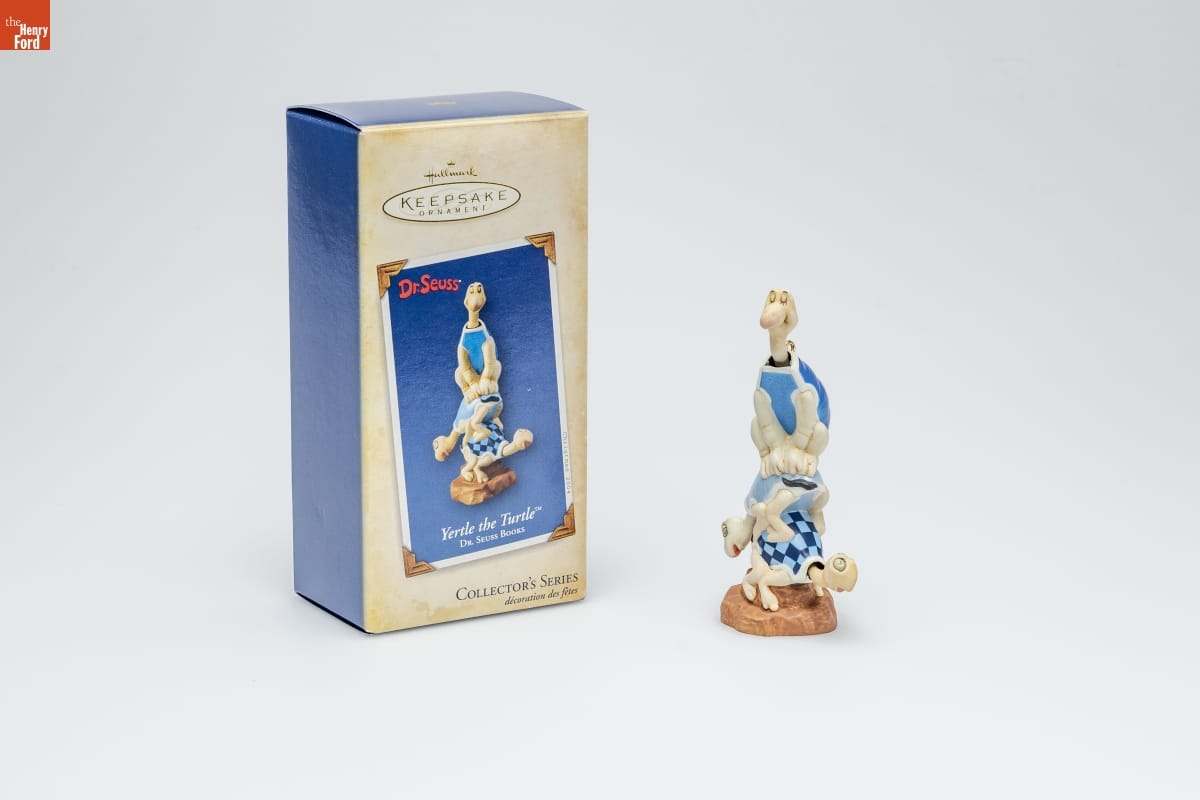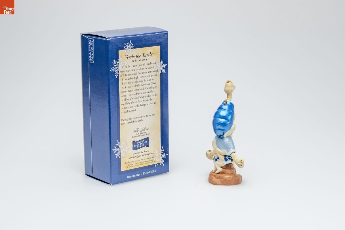 Yertle the Turtle TM / DR. SEUSS BOOKS / Yertle the Turtle rules all that he can / see--a nice little pond on the island / of Sala-ma-Sond. But that's not enough. / "If I could sit high, how much greater / I'd be!" the greedy king declares in / Dr. Seuss's Yertle the Turtle and Other / Stories. Yertle commands his unhappy / subjects to stand upon one another, / building a "throne" that reaches to the / sky. Only a burp from Mack, the / bottommost turtle, brings his rule to / a splashing end. / Press gently on ornament to see the / turtles nod their heads. / Nello Williams / Hallmark Keepsake Artist / HOLIDAY / MEMORY CARD / ENCLOSED / Sixth in the Series. / Look for 6 on this ornament. / For decorative use only. Not for children under 8. / Concue a des fins decoratives seulement. / Ne convient pas aux enfants de moins de 8 ans. / Handcrafted - Dated 2004