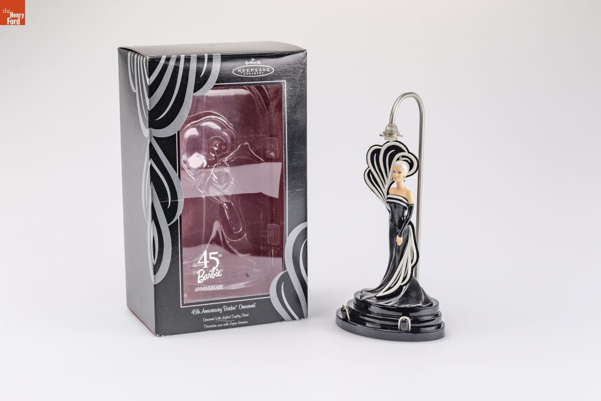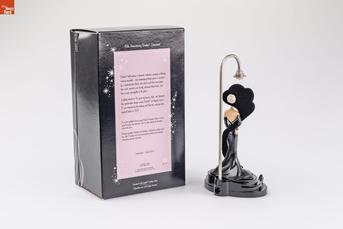 45th Anniversary Barbie(R) Ornament / Barbie(R) doll makes a dramatic entrance wearing a striking / evening ensemble. Her shimmering black gown is accented / by a sophisticated black and white swirl that rises from / her waist, encircles her lovely platinum blond hair, and / then sweeps gracefully to the floor. / A fitting tribute to 45 years of beauty, style, and glamour, / this spectacular design wraps Barbie(R) in elegant curves. / It was inspired by the bathing suit that she wore for her / original debut in 1959. / To see the spotlight shine on your Barbie(R) ornament, place it on the / special display base provided. You can also display the ornament / without the base. / Battery-operated. Batteries not included. Instructions printed inside / box. Note: Display base can be powered by adapter (not included). / Instruction printed inside box. / Handcrafted - Dated 2004 / 45th / Barbie / ANNIVERSARY / For decorative use only. / Not for children under 8. / Concue a des fins decoratives seulement. / Ne convient pas aux enfants de moins de 8 ans. / Ornament With Lighted Display Stand / Decoration avec socle d'appui lumineux