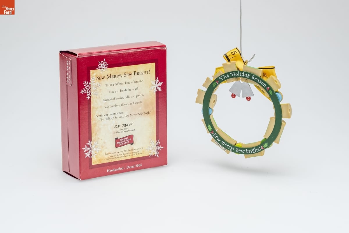SEW MERRY, SEW BRIGHT! / Want a different kind of wreath? / One that bends the rules? / Instead of berries, bells, and greens, / use thimbles, thread, and spools! / Sentiment on ornament: / The Holiday Season...Sew Merry! Sew Bright! / Sue Tague / Hallmark Keepsake Artist / HOLIDAY / MEMORY CARD / ENCLOSED / For decorative use only. Not for children under 8. / Concue a des fins decoratives seulement. / Ne convient pas aux enfants de moins de 8 ans. / Handcrafted - Dated 2004