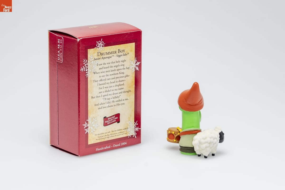 DRUMMER BOY / Junior Asparagus TM - VeggieTales(R) / I saw the star that holy night / and heard the angels sing / When wise men knelt upon the hay / to see the newborn King. / They offered rare and precious gifts-- / I bowed my head in shame-- / For I was just a shepherd, / not a shekel to my name. / But then I spied my drum and thought, / "I'll tap a lullaby!" / And when I did, He smiled at me, / and love shone in His eyes. / HOLIDAY / MEMORY CARD / ENCLOSED / For decorative use only. Not for children under 8. / Concue a des fins decoratives seulement. / Ne convient pas aux enfants de moins de 8 ans. / Handcrafted - Dated 2004