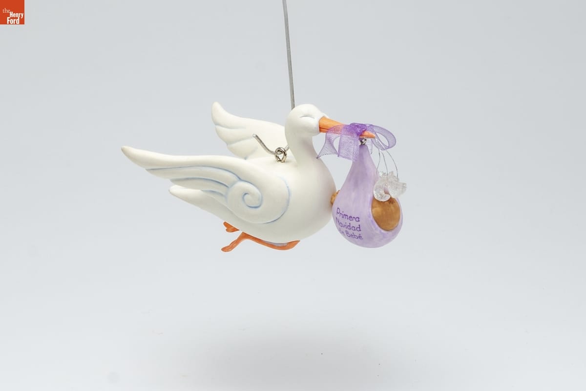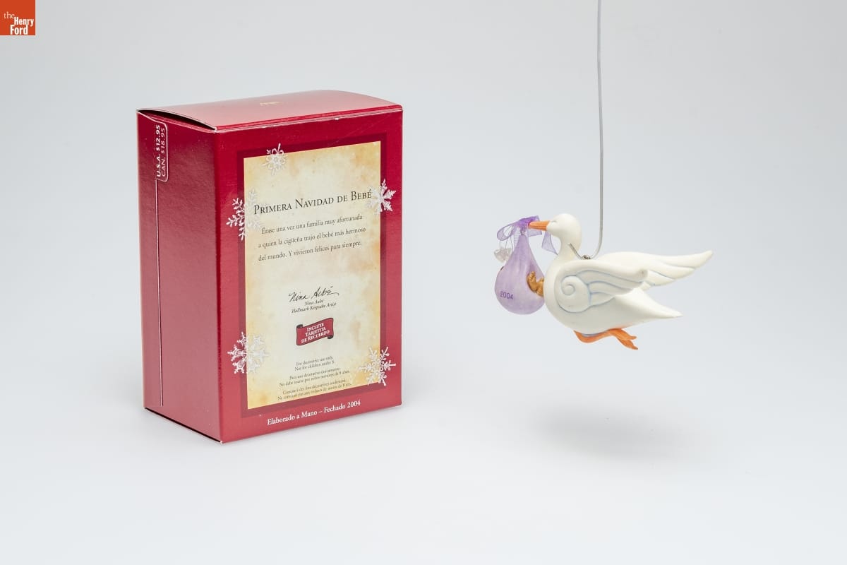 PRIMERA NAVIDAD DE BEBE / Erase una vez una familia muy afortunada / a quien la ciguena trajo el bebe mas hermoso / del mundo. Y vivieron felices para siempre. / Nina Aube / Hallmark Keepsake Artist / INCLUYE / TARJETITA / DE RECUERDO / For decorative use only. / Not for children under 8. / Para uso decorativo unicamente. / No debe usarse por ninos menores de 8 anos. / Concue a des fins decoratives seulement. / Ne convient pas aux enfants de moins de 8 ans. / Elaborado a Mano - Fechado 2004