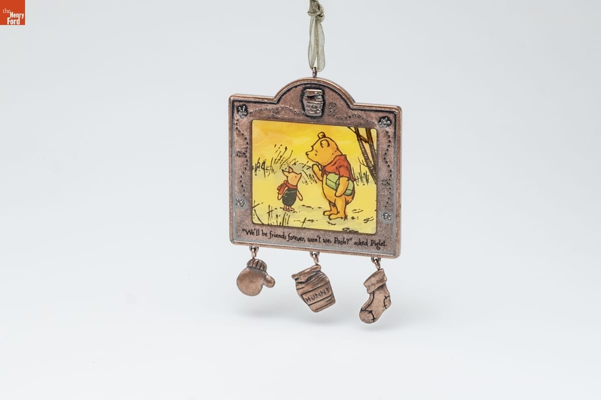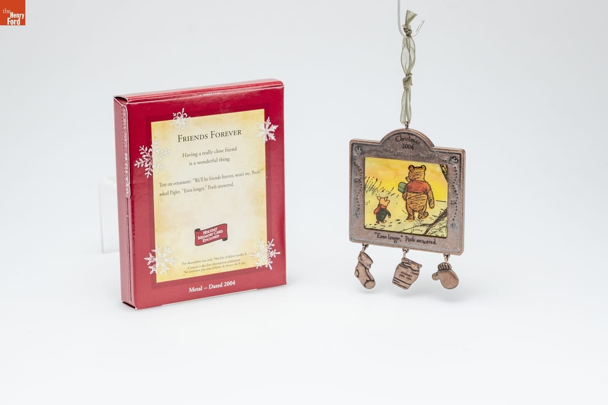 FRIENDS FOREVER / Having a really close friend / is a wonderful thing. / Text on ornament: "We'll be friends forever, won't we, Pooh?" / asked Piglet. "Even longer," Pooh answered. / HOLIDAY / MEMORY CARD / ENCLOSED / For decorative use only. Not for children under 8. / Concue a des fins decoratives seulement. / Ne convient pas aux enfants de moins de 8 ans. / Metal - 2004