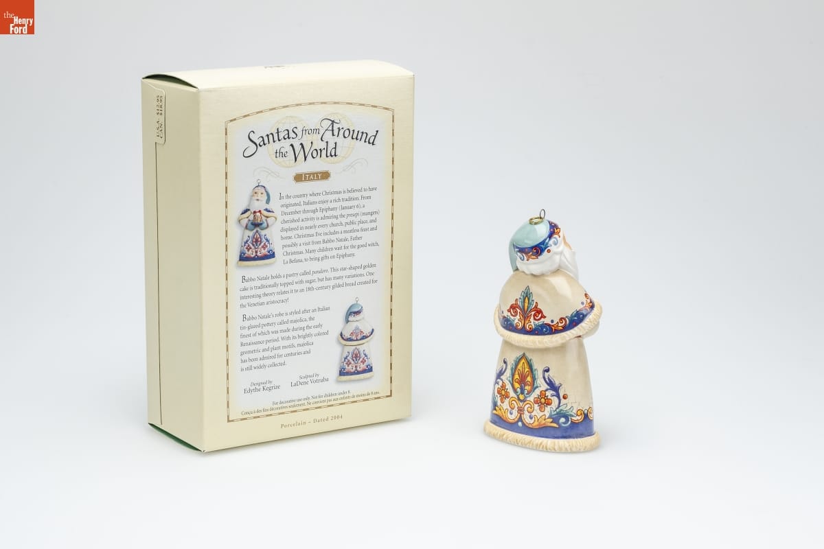 Santas from Around / the World / ITALY / In the country where Christmas is believed to have / originated, Italians enjoy a rich tradition. From / December through Epiphany (January 6), a / cherished activity is admiring the presepi (mangers) / displayed in nearly every church, public place, and / home. Christmas Eve includes a meatless feast and / possibly a visit from Babbo Natale, Father / Christmas. Many children wait for the good witch, / La Befana, to bring gifts on Epiphany. / Babbo Natale holds a pastry called pandoro. This star-shaped golden / cake is traditionally topped with sugar, but has many variations. One / interesting theory relates it to an 18th-century gilded bread created for / the Venetian aristocracy! / Babbo Natale's robe is styled after an Italian / tin-gazed pottery called majolica, the / finest of which was made during the early / Renaissance period. With its brightly colored / geometric and plant motifs, majolica / has been admired for centuries and / is still widely-collected. / Designed by / Edythe Kegrize / Sculpted by / LaDene Votruba / For decorative use only. Not for children under 8. / Concue a des fins decoratives seulement. Ne convient pas aux enfants de moins de 8 ans. / Porcelain - Dated 2004