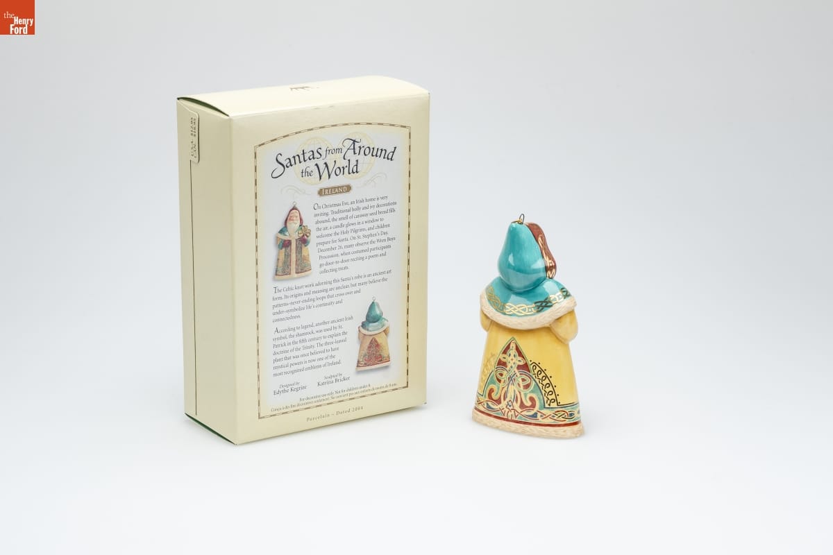 Santas from Around / the World / IRELAND / On Christmas Eve, an Irish home is very / inviting. Traditional holly and ivy decorations / abound, the smell of caraway seed bread fills / the air, a candle glows in a window to / welcome the Holy Pilgrims, and children / prepare for Santa. On St. Stephen's Day, / December 26, many observe the Wren Boys / Procession, when costumed participants / go door-to-door reciting a poem and / collecting treats. / The Celtic knot work adorning this Santa's robe is an ancient art / form. Its origins and meaning are unclear, but many believe the / patterns--never-ending loops that cross over and / under-symbolize life's continuity and / connectedness. / According to legend, another ancient Irish / symbol, the shamrock, was used by St. Patrick in the fifth century to explain the / doctrine of the Trinity. The three-leaved / plant that was once believed to have / mystical powers is now one of the / most recognized emblems of Ireland. / Designed by / Edythe Kegrize / Sculpted by / Katrina Bricker / For decorative use only. Not for children under 8. / Concue a des fins decoratives seulement. Ne convient pas aux enfants de moins de 8 ans. / Porcelain - Dated 2004