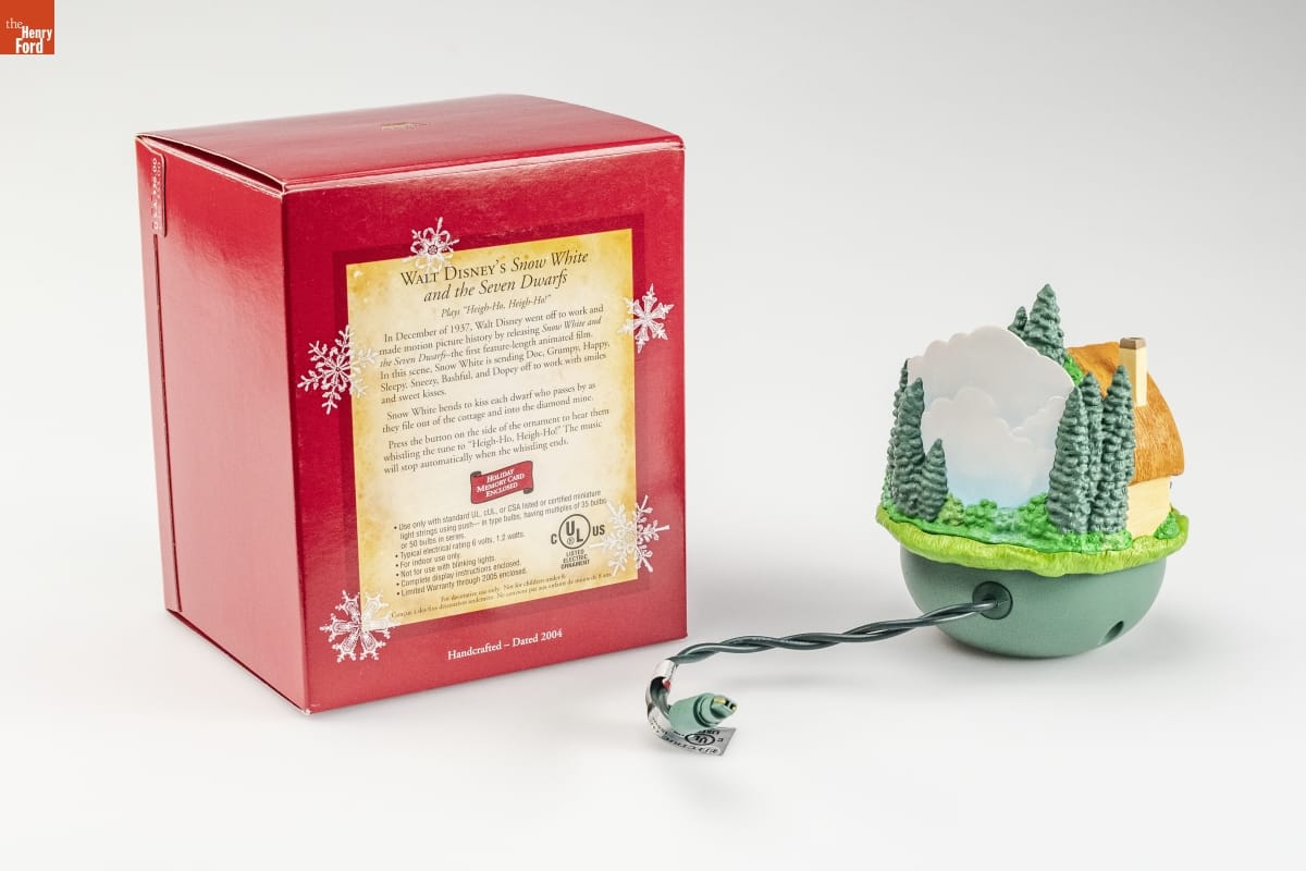 WALT DISNEY'S Snow White / and the Seven Dwarfs / Plays "Heigh-Ho, Heigh-Ho!" / In December of 1937, Walt Disney went off to work and / made motion picture history by releasing Snow White and / the Seven Dwarfs--the first feature-length animated film. / In this scene, Snow White is sending Doc, Grumpy, Happy, / Sleepy, Sneezy, Bashful, and Dopey off to work with smiles / and sweet kisses. / Snow White bends to kiss each dwarf who passes by as / they file out of the cottage and into the diamond mine. / Press the button on the side of the ornament to hear them / whistling the tune to "Heigh-Ho, Heigh-Ho!" The music / will stop automatically when the whistling ends. / HOLIDAY / MEMORY CARD / ENCLOSED / Use only with standard UL, cUL, or CSA listed or certified miniature / light strings using push--in type bulbs, having multiples of 35 bulbs / or 50 bulbs in series. / Typical electrical rating 6 volts, 1.2 watts. / For indoor use only. / Not for use with blinking lights. / Complete display instructions enclosed. / Limited Warranty through 2005 enclosed. / C UL(R) US / LISTED / ELECTRIC / ORNAMENT / For decorative use only. Not for children under 8. / Concue a des fins decoratives seulement. Ne convient pas aux enfants de moins de 8 ans. / Handcrafted - Dated 2004
