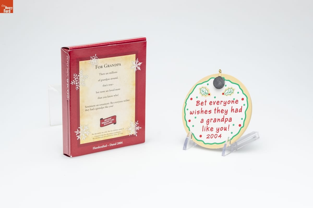 FOR GRANDPA / There are millions / of grandpas around, / that's true-- / but none are loved more / than you-know-who! / Sentiment on ornament: / Bet everyone wishes / they had a grandpa like you! / HOLIDAY / MEMORY CARD / ENCLOSED / For decorative use only. Not for children under 8. / Concue a des fins decoratives seulement. / Ne convient pas aux enfants de moins de 8 ans. / Handcrafted - Dated 2004