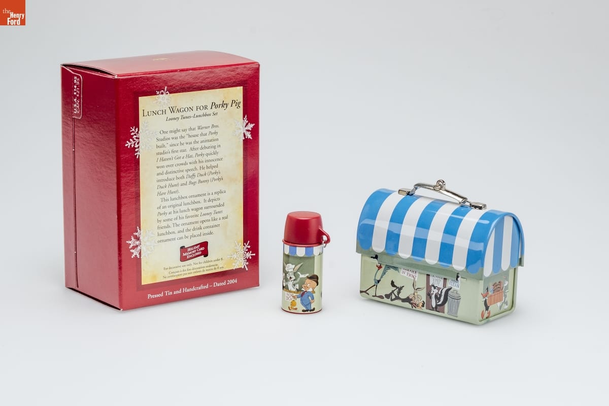 LUNCH WAGON FOR Porky Pig / Looney Tunes-Lunchbox Set / One might say that Warner Bros. / Studios was the "house that Porky / built," since he was the animation / studio's first star. After debuting in / I Haven't Got a Hat, Porky quickly / won over crowds with his innocence / and distinctive speech. He helped / introduce both Daffy Duck (Porky's / Duck Hunt) and Bugs Bunny (Porky's / Hare Hunt). / This lunchbox ornament is a replica / of an original lunchbox. It depicts / Porky at his lunch wagon surrounded / by some of his favorite Looney Tunes / friends. The ornament opens like a real / lunchbox, and the drink container / ornament can be placed inside. / HOLIDAY / MEMORY CARD / ENCLOSED / For decorative use only. Not for children under 8. / Concue a des fins decoratives seulement. / Ne convient pas aux enfants de moins de 8 ans. / Pressed Tin and Handcrafted - Dated 2004