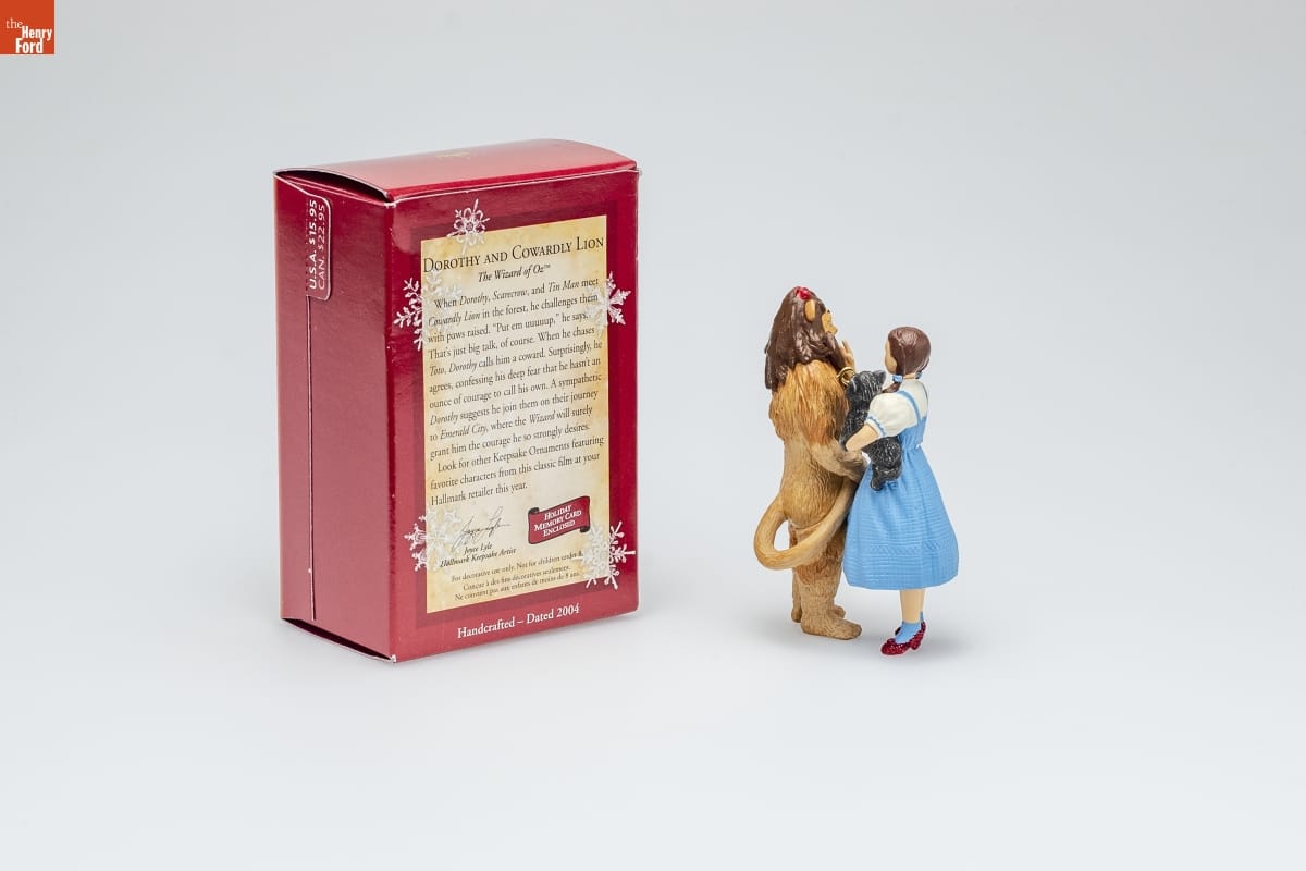 DOROTHY AND COWARDLY LION / The Wizard of Oz TM / When Dorothy, Scarecrow, and Tin Man meet / Cowardly Lion in the forest, he challenges them / with paws raised. "Put em uuuuup," he says. / That's just big talk, of course. When he chases / Toto, Dorothy calls him a coward. Surprisingly, he / agrees, confessing his deep fear that he hasn't an / ounce of courage to call his own. A sympathetic / Dorothy suggests he join them on their journey / to Emerald City, where the Wizard will surely / grant him the courage he so strongly desires. / Look for other Keepsake Ornaments featuring / favorite characters from this classic film at your / Hallmark retailer this year. / Joyce Lyle / Hallmark Keepsake Artist / HOLIDAY / MEMORY CARD / ENCLOSED / For decorative use only. Not for children under 8. / Concue a des fins decoratives seulement. / Ne convient pas aux enfants de moins de 8 ans. / Handcrafted - 2004