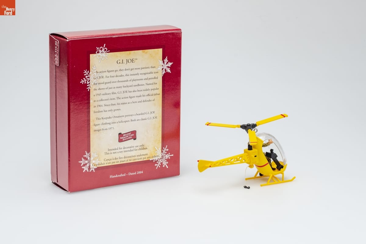 G.I. JOE TM / As action figures go, they don't get more patriotic than / G.I. JOE. For four decades, this instantly recognizable icon / had stood guard over thousands of playrooms and patrolled / the shores of just as many backyard sandboxes. Named for / a 1945 military film, G.I. JOE has also been widely popular / as a collector's item. The action figure made his official debut / in 1964. Since then, his status as a hero and defender of / freedom has only grown. / This Keepsake Ornament portrays a bearded G.I. JOE / figure climbing into a helicopter. Both are classic G.I. JOE / images from 1971. / HOLIDAY / MEMORY CARD / ENCLOSED / Intended for decorative use only. / This is not a toy intended for children. / Concue a des fins decoratives seulement. / Ce produit n'est pas un jouet et ne convient pas aux enfants. / Handcrafted - Dated 2004