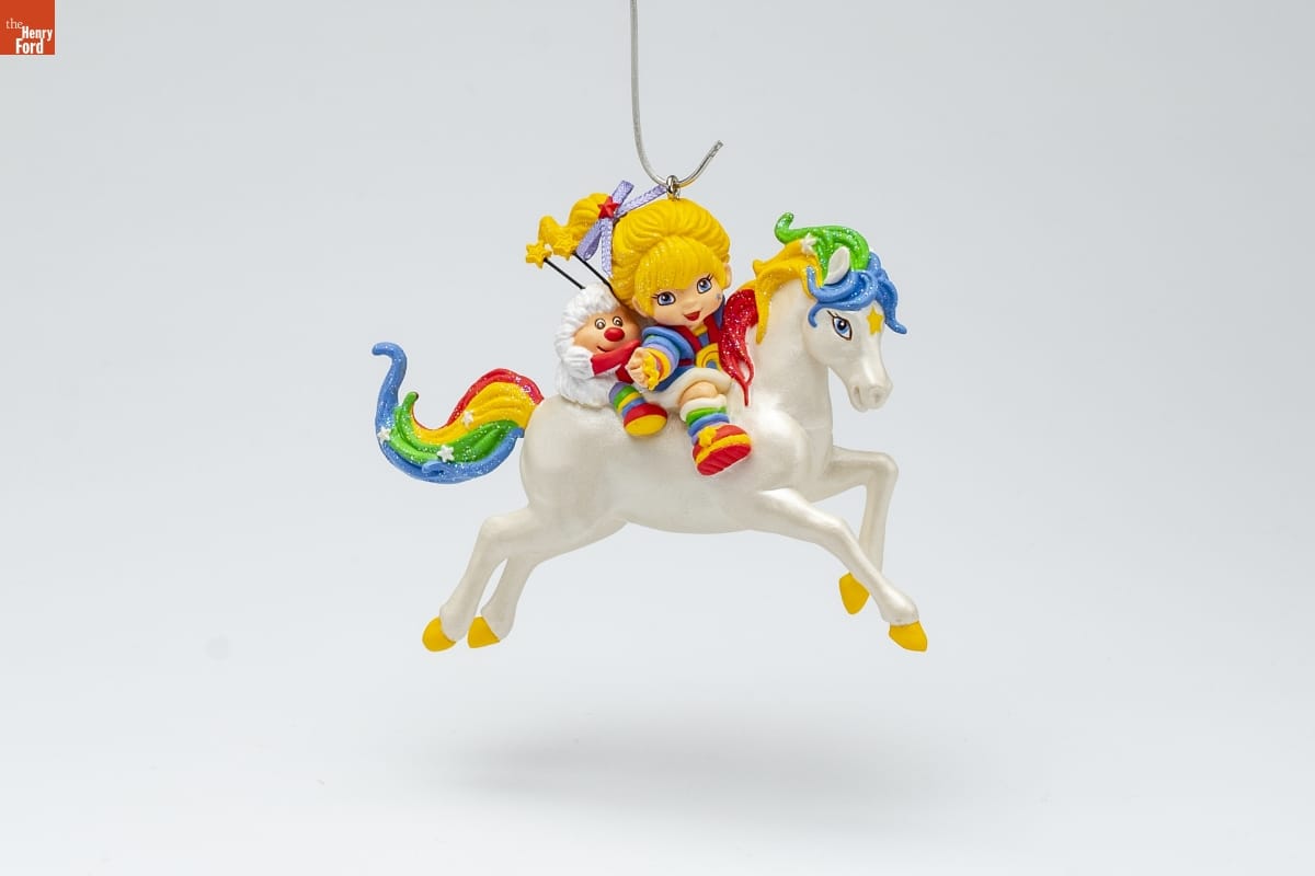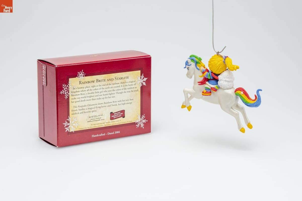 RAINBOW BRITE AND STARLITE / In a faraway place, right at the end of the rainbow, there is a magical / kingdom where all the colors of the earth are created. It is the home of / Rainbow Brite, a lovable little girl who uses the colors of the rainbow to / make our world brighter and our hearts lighter. Though she may be small, / her good deeds more than make up for her size. / This Keepsake Ornament shows Rainbow Brite with her very best / friend, Starlite--a magical flying horse--and Twink, her high-energy / sidekick and favorite sprite. / Joanne Eschrich / Hallmark Keepsake Artist / HOLIDAY / MEMORY CARD / ENCLOSED / For decorative use only. Not for children under 8. / Concue a des fins decoratives seulement. Ne convient pas aux enfants de moins de 8 ans. / Handcrafted - Dated 2004