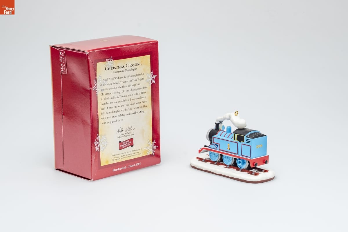 CHRISTMAS CROSSING / Thomas the Tank Engine / Peep! Peep! With smoke billowing from his / shiny black funnel, Thomas the Tank Engine / merrily toots his whistle as he chugs into / Christmas Crossing. On special assignment from / Sir Topham Hatt, Thomas gets a holiday break / from his normal branch line duties to collect a / load of presents for the children of Sodor. Soon / he'll be making his way back to the station filled / with even more holiday spirit and brimming / with jolly good cheer! / Nello Williams / Hallmark Keepsake Artist / HOLIDAY / MEMORY CARD / ENCLOSED / For decorative use only. Not for children under 8. / Concue a des fins decoratives seulement. / Ne convient pas aux enfants de moins de 8 ans. / Handcrafted - Dated 2004