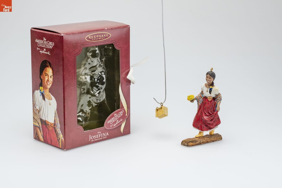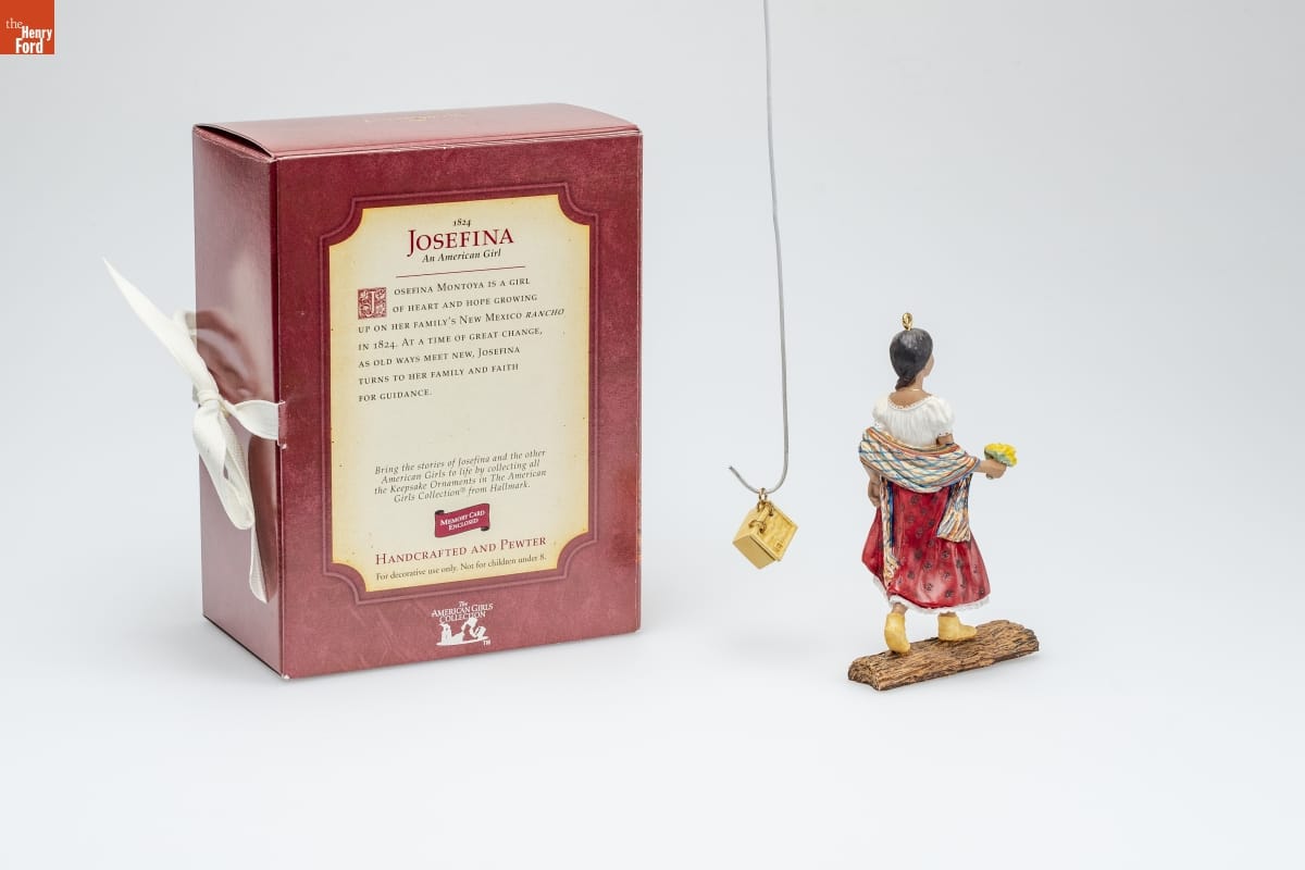 on bottom of Josefina ornament: Josefina / An American Girl / (C) Pleasant Company. / Hallmark Cards Inc. on front of packaging: KEEPSAKE / ORNAMENT / The / AMERICAN GIRLS / COLLECTION(R) / from / Hallmark / 1824 / JOSEFINA / An American Girl on back of packaging: 1824 / JOSEFINA / An American Girl / JOSEFINA MONTOYA IS A GIRL / OF HEART AND HOPE GROWING / UP ON HER FAMILY'S NEW MEXICO RANCH / IN 1824. AT A TIME OF GREAT CHANGE, / AS OLD WAYS MEET NEW, JOSEFINA / TURNS TO HER FAMILY AND FAITH / FOR GUIDANCE. / Bring the stories of Josefina and the other / American Girls to life by collecting all / the Keepsake Ornaments in The American / Girls Collection(R) from Hallmark. / MEMORY CARD / ENCLOSED / HANDCRAFTED AND PEWTER / For decorative use only. Not for children under 8. / The / AMERICAN GIRLS / COLLECTION / TM on inside back of packaging: PRIMROSES / DURING LAUNDRY ON A SUNNY / SUMMER DAY, JOSEFINA AND HER / SISTERS SPY A CLUSTERS OF EVENING / PRIMROSES ON THE OPPOSITE BANK OF THE / STREAM. THE SISTERS RECALL HOW MAMA / HAD LOVED THE TINY YELLOW FLOWERS. / JOSEFINA JUMPS UP ON A LOG THAT LEADS / ACROSS THE STREAM, GATHERS THE / BLOSSOMS, AND TUCKS THEM GENTLY IN / THE POUCH AT HER WAIST. LATER, SHE / WILL DRY THE FLOWERS AND PUT THEM IN / HER LITTLE WOODEN MEMORY BOX TO / REMIND HER OF MAMA. / ON HER WAY BACK ACROSS THE STREAM, / SHE DECIDES TO TEASE ANA. PRETENDING / TO LOSE HER BALANCE, MISCHIEVOUS / JOSEFINA SOON HAS ANA GIGGLING AND / LAUGHING AS ONLY A LITTLE SISTER / COULD! / The enclosed miniature ornament represents / Josefina's memory box. on top of packaging: Hallmark on bottom of packaging: Hallmark Licensing, Inc. / Mfd. for Hallmark Cards, Inc. / Kansas City, MO 64141 / Made in China QAC6434 / www.hallmark.com / Copyright (C) 2004 Pleasant Company. All rights reserved. / The trademark The American Girls Collection / is used under license from Pleasant Company. / To learn more about The American Girls Collection(R), / call Pleasant Company at 1-800-845-0005. / americangirl.com