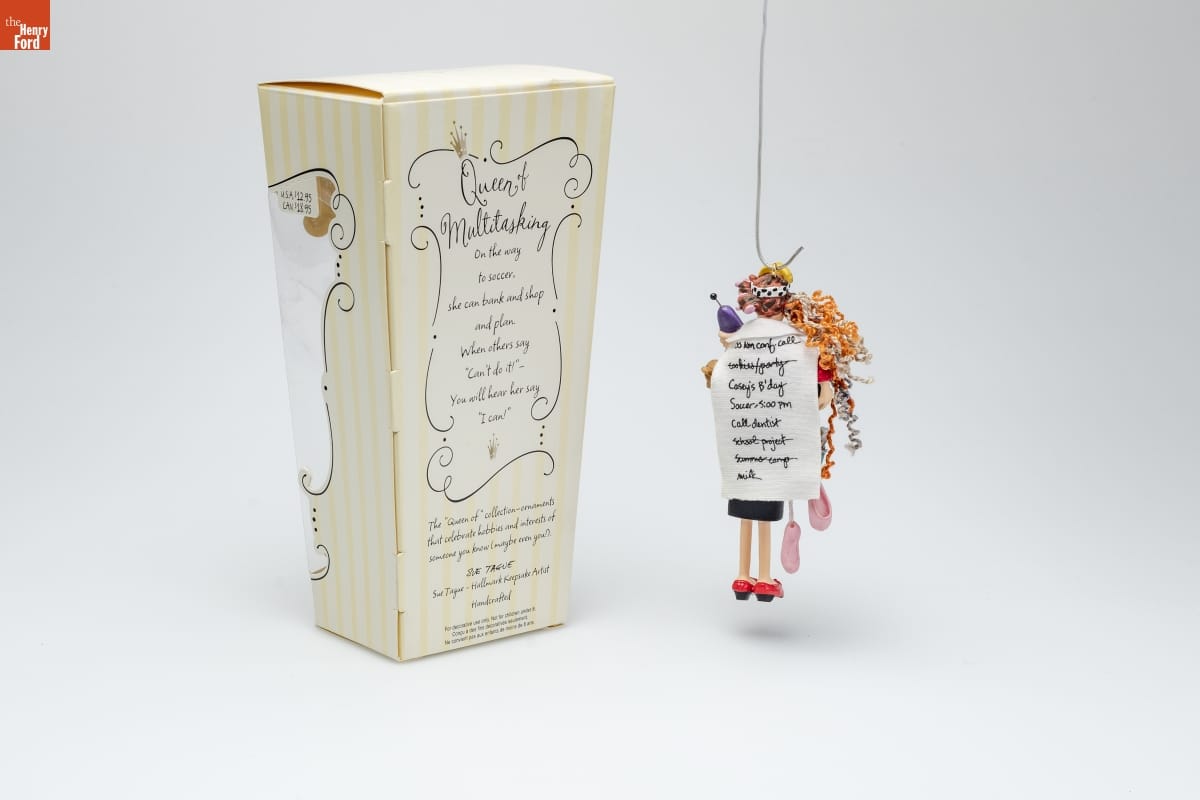 Queen of / Multitasking / On the way / to soccer, / she can bank and shop / and plan. / When others say / "Can't do it!" -- / You will hear her say / "I can!" / The "Queen of" collection - ornaments / that celebrate hobbies and interests of / someone you know (maybe even you!). / SUE TAGUE / Sue Tague - Hallmark Keepsake Artist / Handcrafted / For decorative use only. Not for children under 8. / Concue a des fins decorative seulement. / Ne convient pas aux enfants de moins de 8 ans.