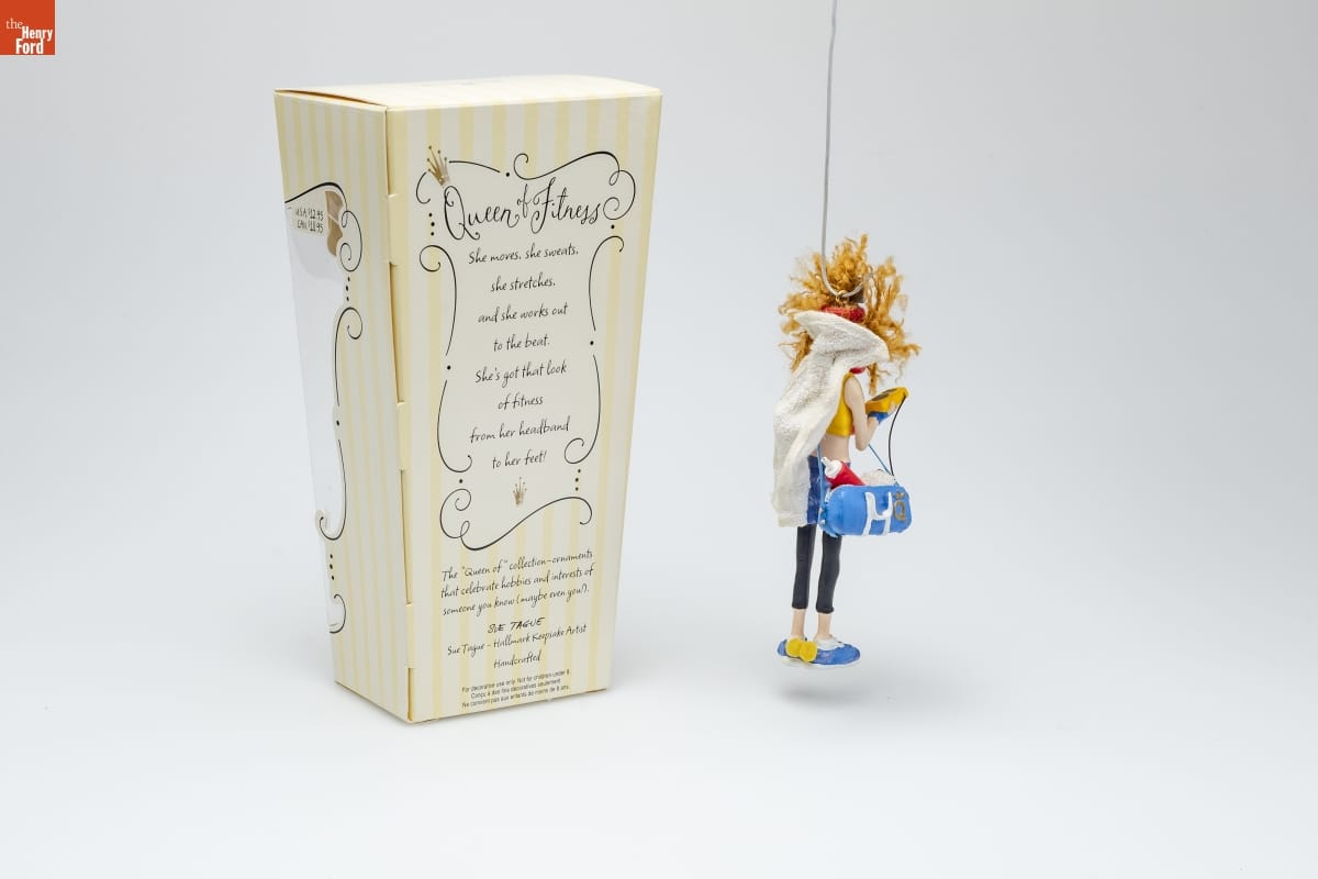 Queen of Fitness / She moves, she sweats, / she stretches, / and she works out / to the beat. / She's got that look / of fitness / from her headband / to her feet! / The "Queen of" collection - ornaments / that celebrate hobbies and interests of / someone you know (maybe even you!). / SUE TAGUE / Sue Tague - Hallmark Keepsake Artist / Handcrafted / For decorative use only. Not for children under 8. / Concue a des fins decorative seulement. / Ne convient pas aux enfants de moins de 8 ans.