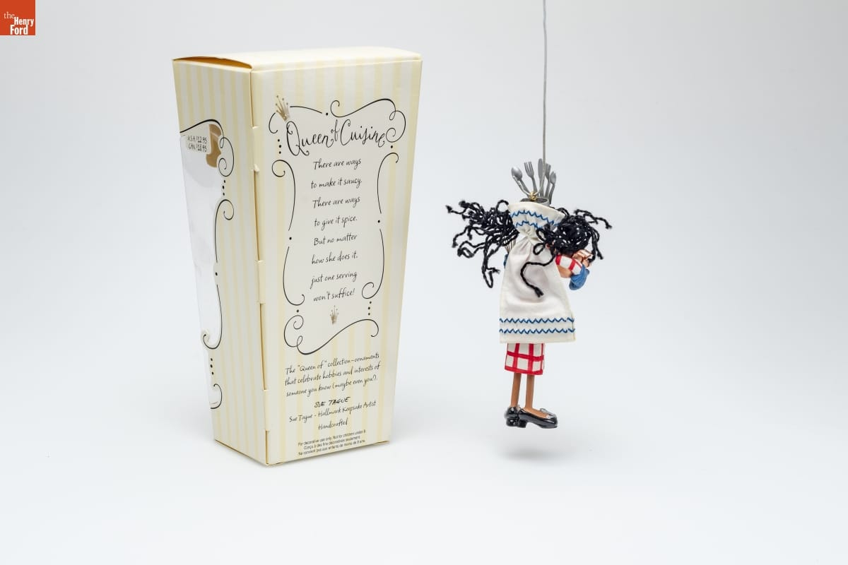 Queen of / Cuisine / There are ways / to make it saucy. / There are ways to give it spice. / But no matter / how she does it, / just one serving / won't suffice! / The "Queen of" collection - ornaments / that celebrate hobbies and interests of / someone you know (maybe even you!). / SUE TAGUE / Sue Tague - Hallmark Keepsake Artist / Handcrafted / For decorative use only. Not for children under 8. / Concue a des fins decorative seulement. / Ne convient pas aux enfants de moins de 8 ans.