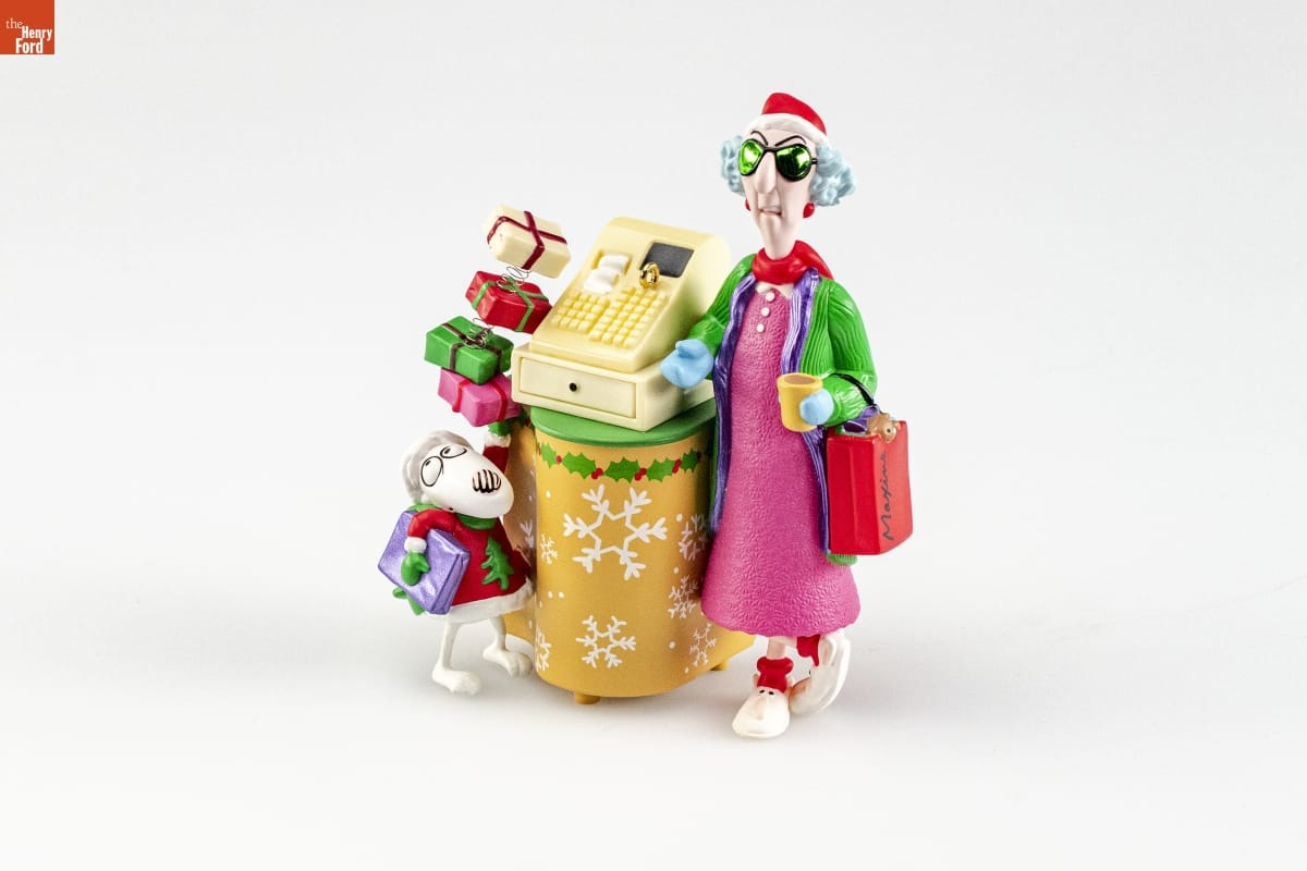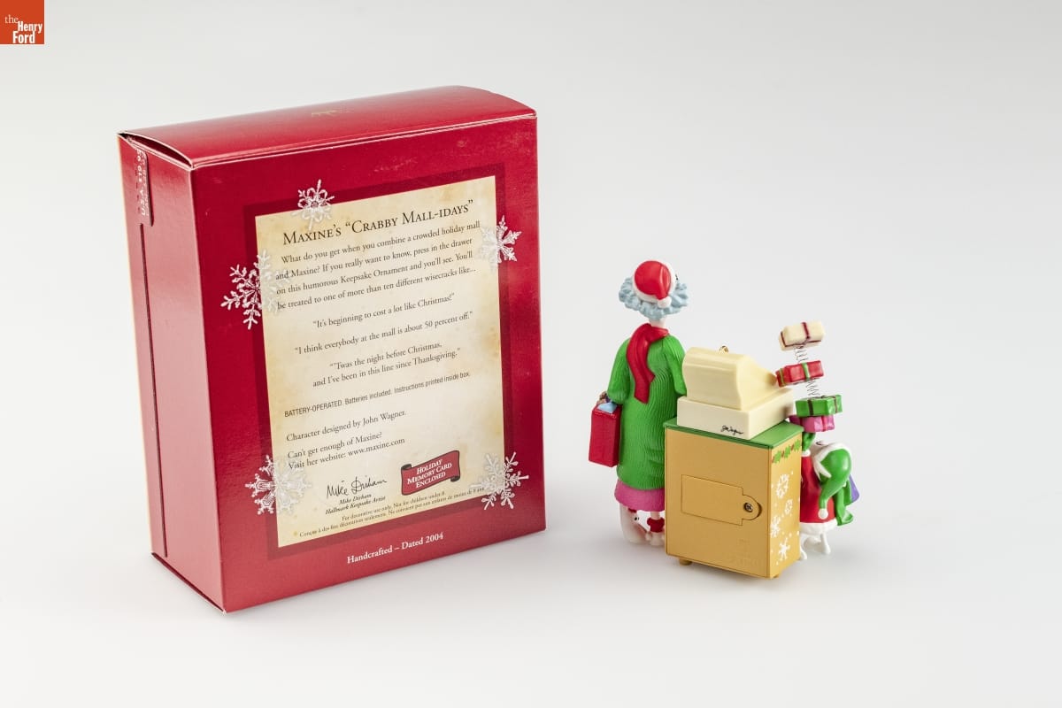MAXINE'S "CRABBY MALL-IDAYS" / What do you get when you combine a crowded holiday mall / and Maxine? If you really want to know, press in the drawer / on this humorous Keepsake Ornament and you'll see. You'll / be treated to one of more than ten different wisecracks like... / "It's beginning to cost a lot like Christmas!" / "I think everybody at the mall is about 50 percent off." / "'Twas the night before Christmas, / and I've been in this line since Thanksgiving." / BATTERY-OPERATED. Batteries included. Instructions printed inside box. / Character designed by John Wagner. / Can't get enough of Maxine? / Visit her website: www.maxine.com / Mike Dirham / Hallmark Keepsake Artist / HOLIDAY / MEMORY CARD / ENCLOSED / For decorative use only. Not for children under 8. / Concue a des fins decoratives seulement. Ne convient pas aux enfants de moins de 8 ans. / Handcrafted - Dated 2004
