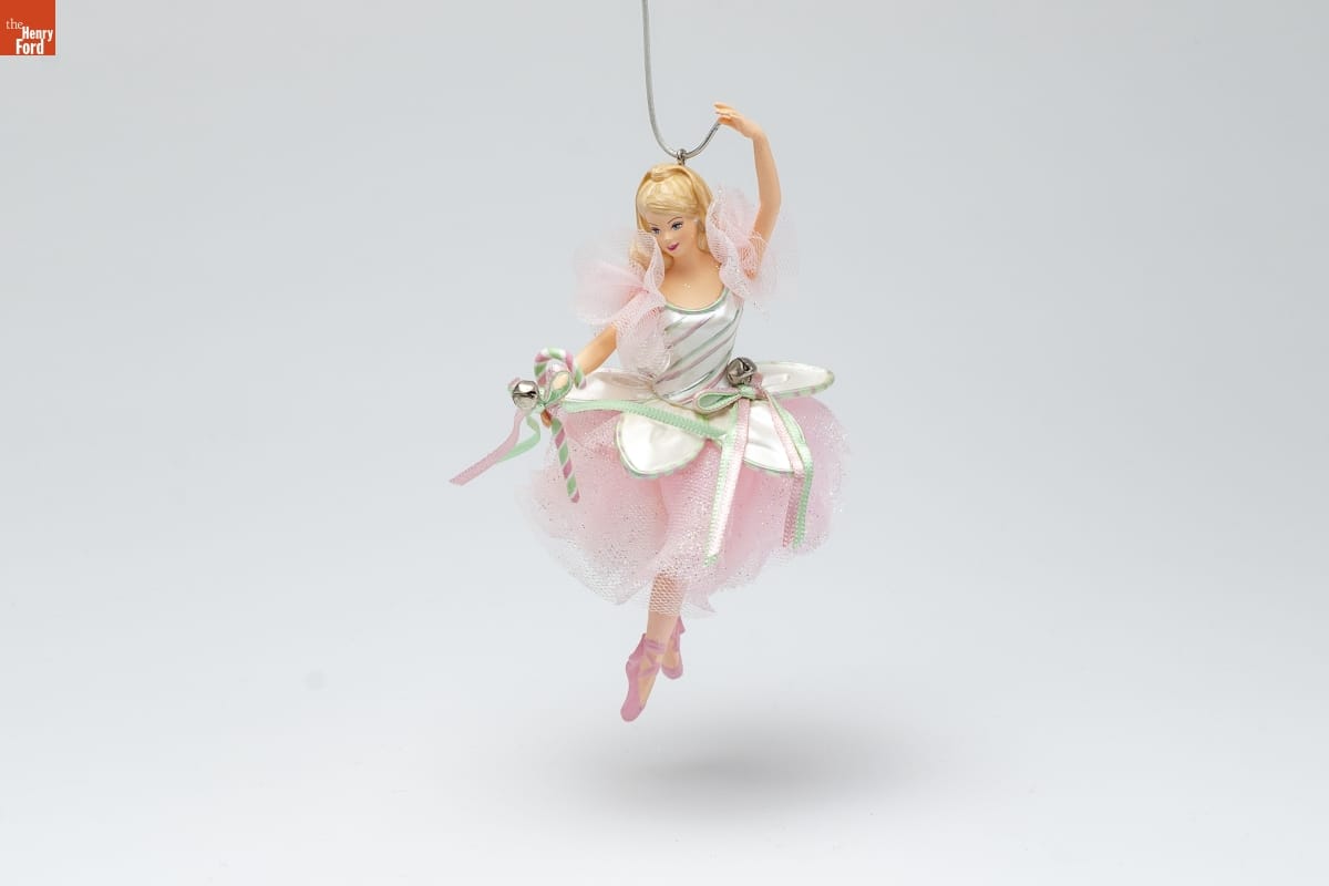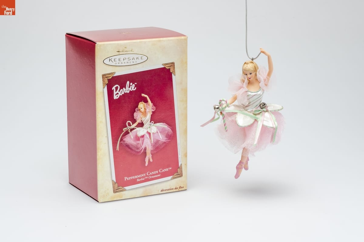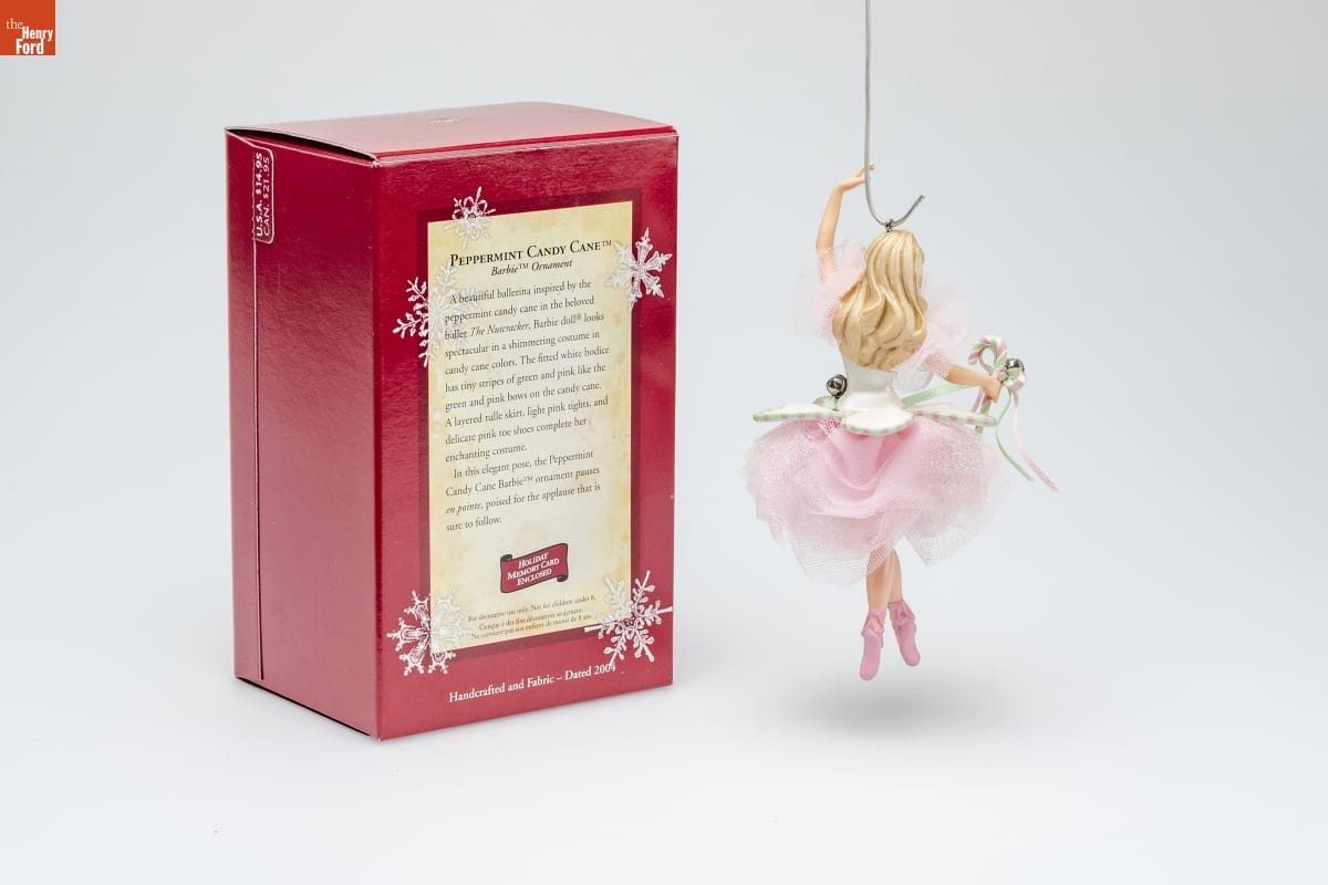 PEPPERMINT CANDY CANE TM / Barbie TM Ornament / A beautiful ballerina inspired by the / peppermint candy cane in the beloved / ballet The Nutcracker, Barbie doll(R) looks / spectacular in a shimmering costume in / candy cane colors. The fitted white bodice / has tiny stripes of green and pink like the / green and pink bows on the candy cane. / A layered tulle skirt, light pink tights, and / delicate pink toe shoes complete her / enchanting costume. / In this elegant pose, the Peppermint / Candy Cane Barbie TM ornament pauses / en pointe, poised for the applause that is / sure to follow. / HOLIDAY / MEMORY CARD / ENCLOSED / For decorative use only. Not for children under 8. / Concue a des fins decoratives seulement. / Ne convient pas aux enfants de moins de 8 ans. / Handcrafted and Fabric - Dated 2004