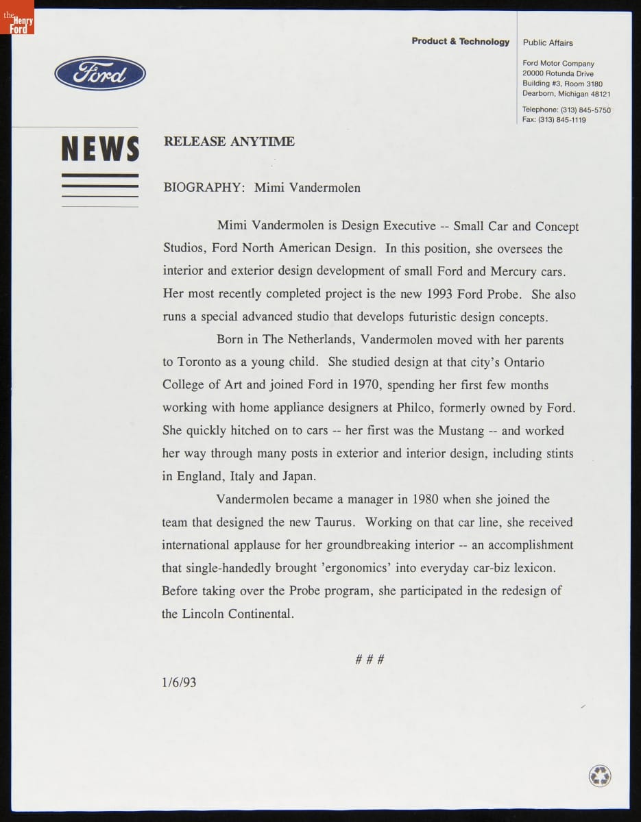 Ford Motor Company Press Release, "Biography - Mimi Vandermolen," January 6, 1993