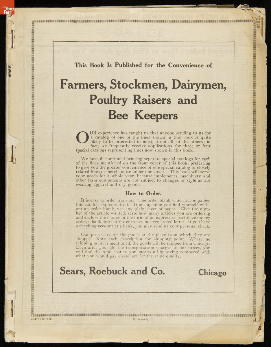 Sears, Roebuck and Company Trade Catalog for Farmers, Stockmen, Dairymen, Poultry Raisers, and Bee Keepers, 1915