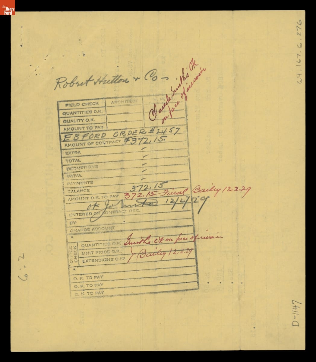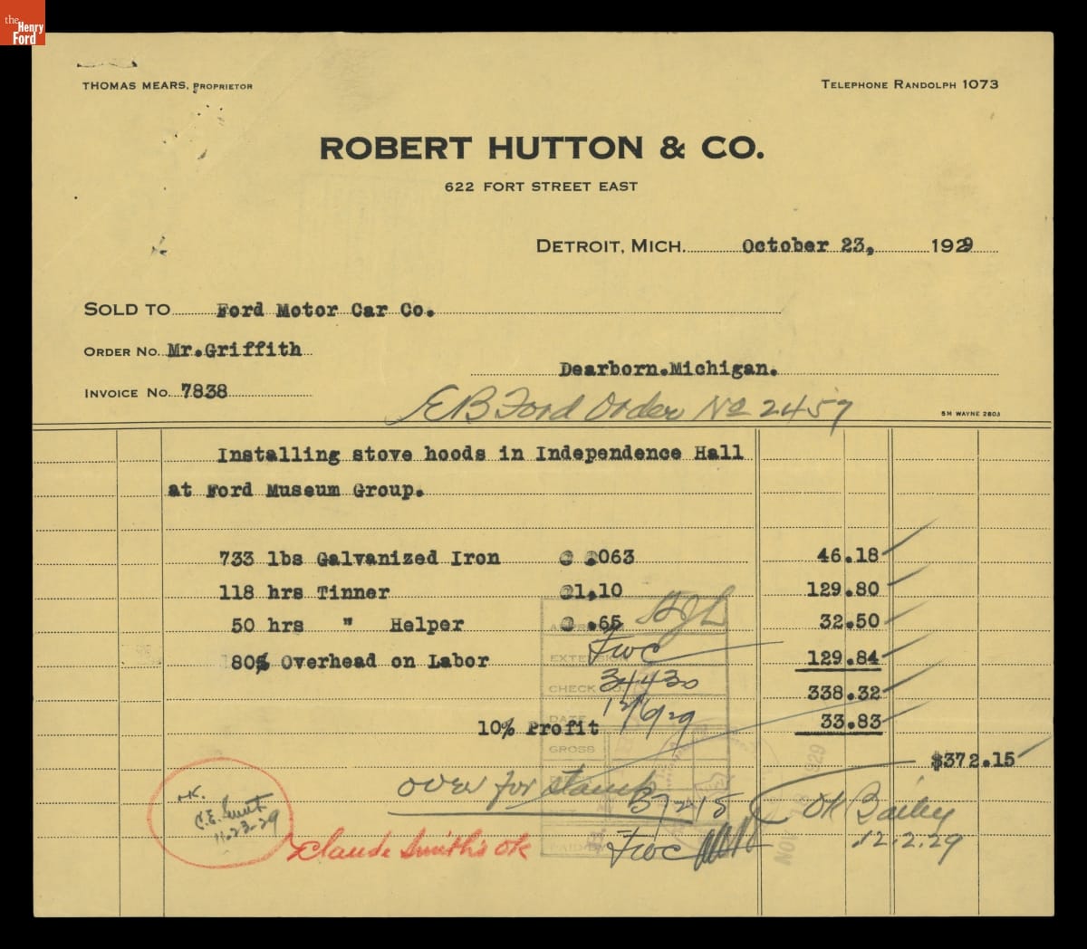 Invoice for Stove Hoods Installed in Henry Ford Museum before Light's Golden Jubilee, October 1929