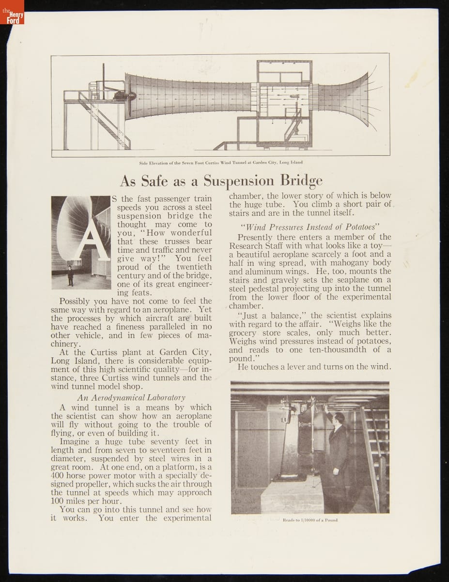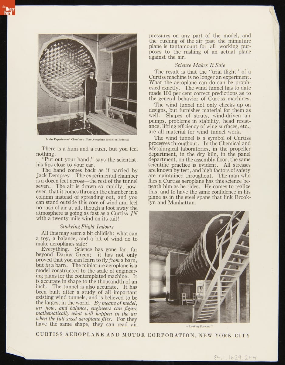 Glenn Curtiss, whose airplane business flourished during World War I, established a state-of-the-art research and experimentation facility on Long Island, New York, in 1917. At the Curtiss Engineering Corporation, a handpicked team built, tested, and refined propellers, engines, and airplanes. This brochure claimed a scientific approach made Curtiss airplanes as safe as the more established modes of transportation Americans already trusted.