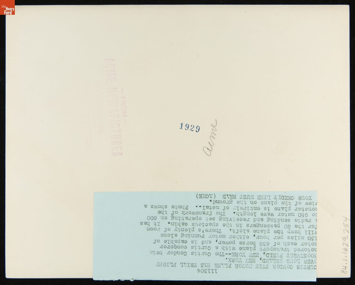 The Curtiss Condor airplane had its origins in a twin-engine military bomber introduced in 1929. The civilian version carried 18 passengers and flew for commercial airlines. With its biplane wings and closed cockpit, the Condor was something of a bridge between pioneering aircraft like Boeing's Model 40 and more modern airliners like Douglas's DC-3.