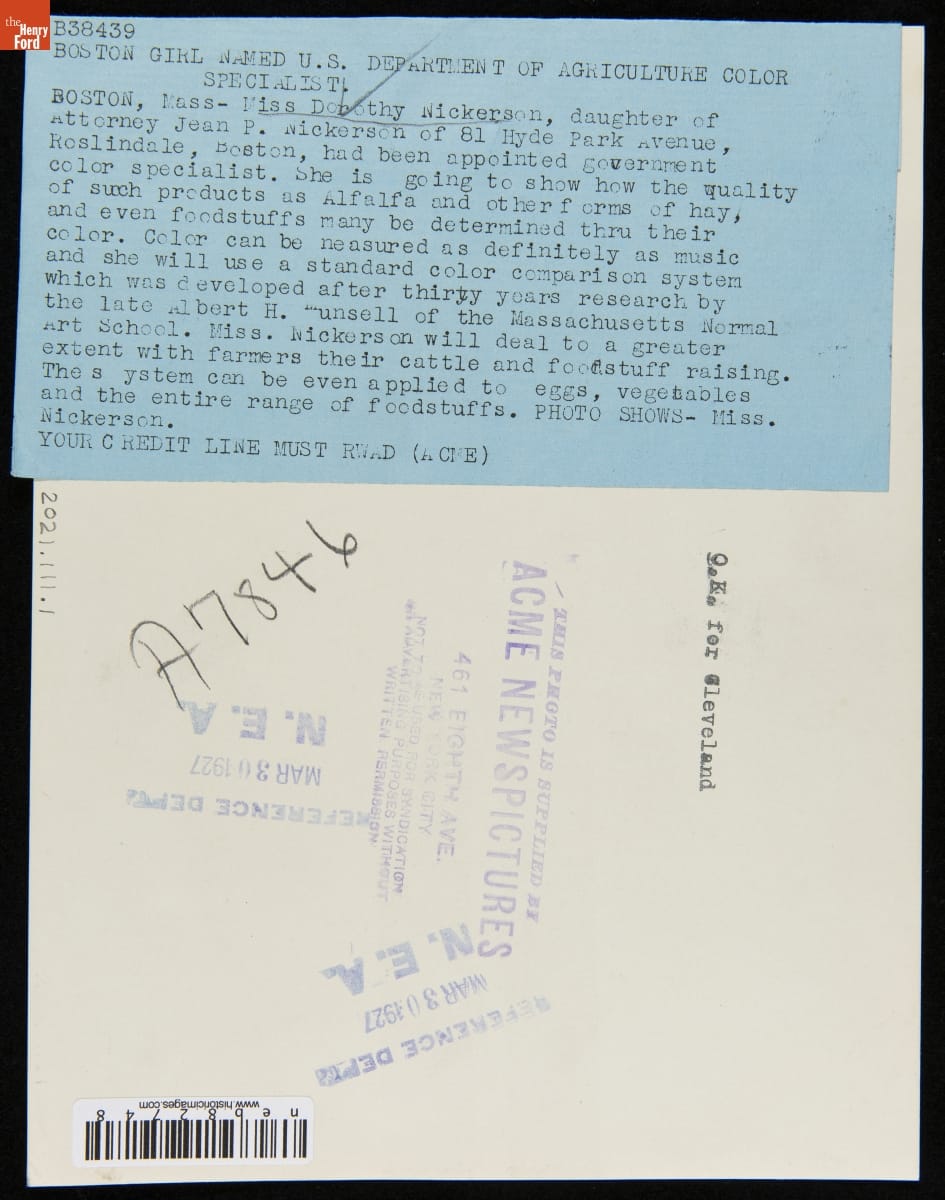 Dorothy Nickerson of Boston Named United States Department of Agriculture Color Specialist, March 30, 1927