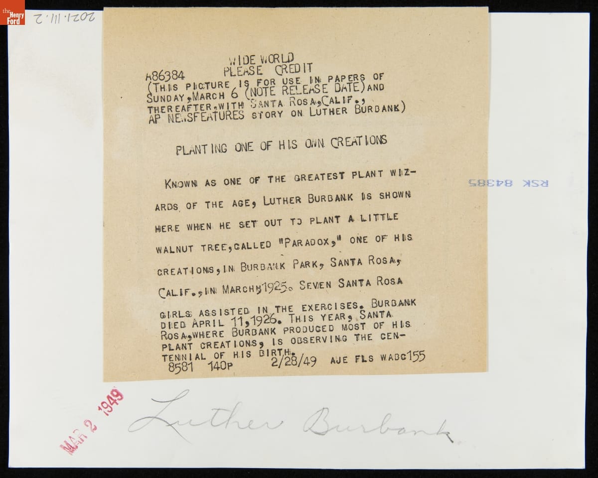Luther Burbank Planting a "Paradox," a Type of Walnut Tree He Created, Burbank Park, Santa Rosa, California, March 1925