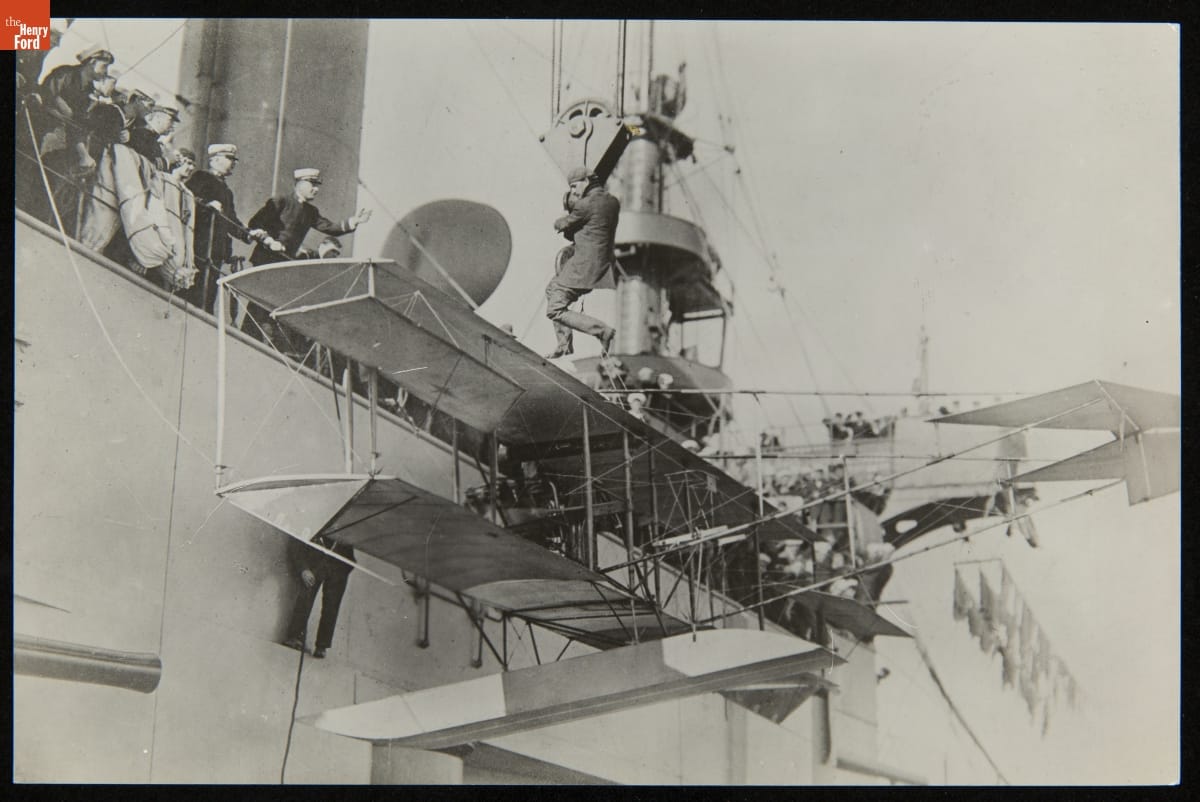 Glenn Curtiss and His Hydroaeroplane Being Hoisted Aboard the Armored Cruiser Pennsylvania, February 17, 1911