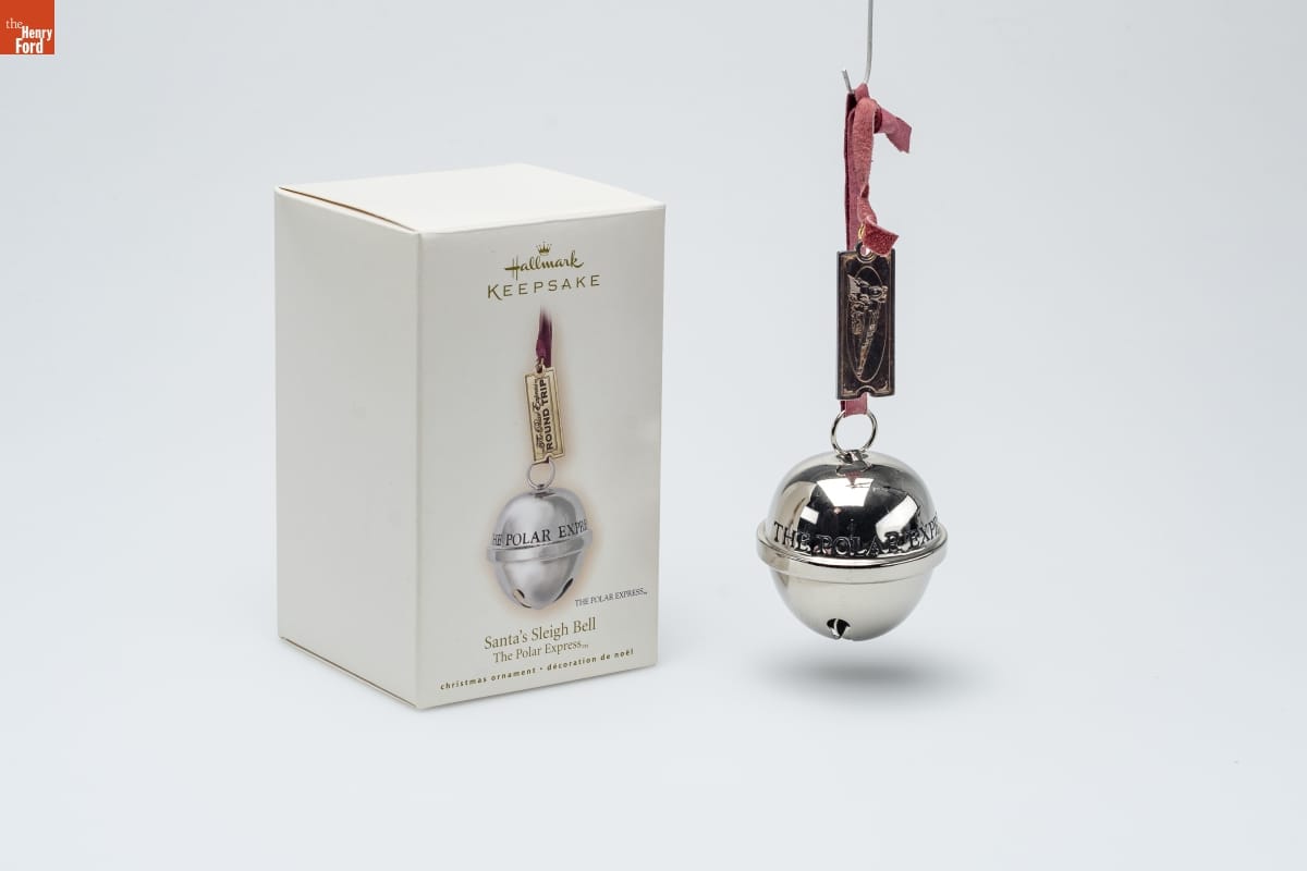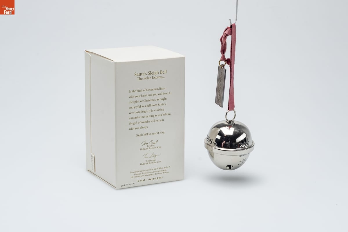 Santa's Sleigh Bell / The Polar Express [TM] / In the hush of December, listen / with your heart and you will hear it-- / the spirit of Christmas, as bright / and joyful as a bell from Santa's / very own sleigh. It is a shining / reminder that as long as you believe, / the gift of wonder will remain / with you always. / Jingle bell to hear it ring. / Tom Best / Hallmark Keepsake Artist / Terri Steiger / Hallmark Keepsake Artist / For decorative use only. Not for children under 8. / Concu a des fins decoratives seulement. / Ne convient pas aux enfants de moins de 8 ans. / metal - dated 2007