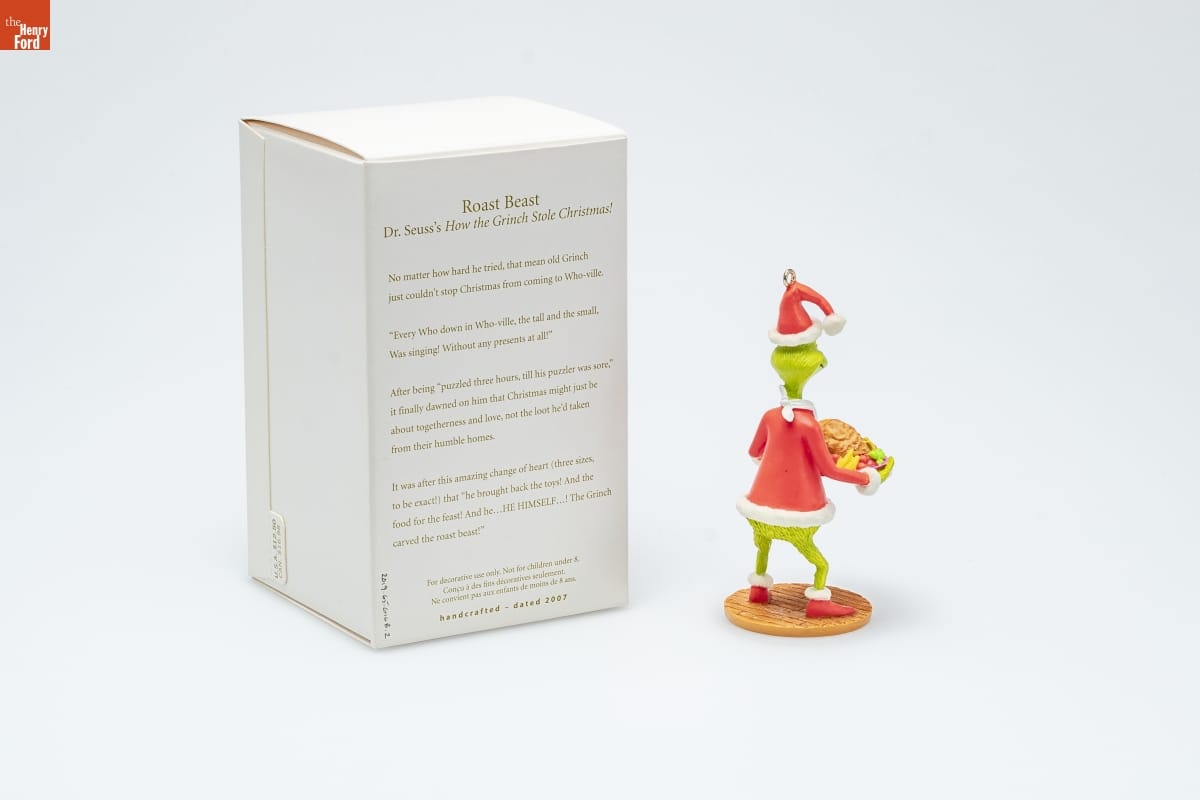 Roast Beast / Dr. Seuss's How the Grinch Stole Christmas! [TM] / No matter how hard he tried, that mean old Grinch / just couldn't stop Christmas from coming to Who-ville. / "Every Who down in Who-ville, the tall and the small, / Was singing! Without any presents at all!" / After being "puzzled three hours, till his puzzler was sore," / it finally dawned on him that Christmas might just be / about togetherness and love, not the loot he'd taken / from their humble homes. / It was after this amazing change of heart (three sizes, / to be exact!) that "he brought back the toys! And the / food for the feast! And he...HE HIMSELF...! The Grinch / carved the roast beast! / For decorative use only. Not for children under 8. / Concu a des fins decoratives seulement. / Ne convient pas aux enfants de moins de 8 ans. / handcrafted - dated 2007