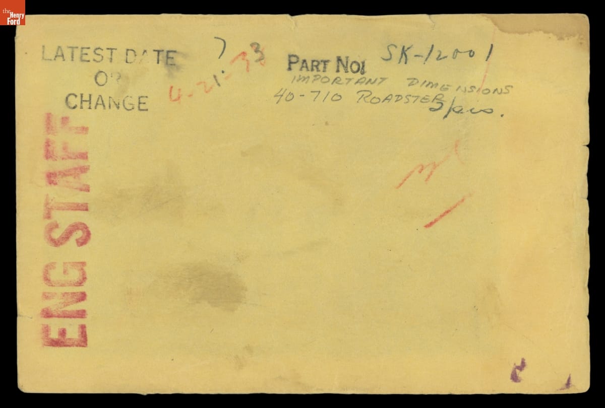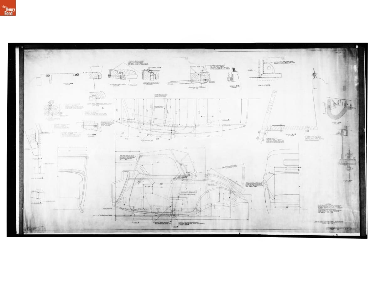 The Ford Motor Company created over a million parts drawings from 1903 to 1957. Many of these drawings specify engineering requirements for the components of Ford-made vehicles--including automobiles, trucks, tractors, military vehicles and Tri-motor airplanes. Others document assembly components, stages of casting and forging, or experimental designs. Beginning in the 1940s, Ford transferred the drawings to microfilm.