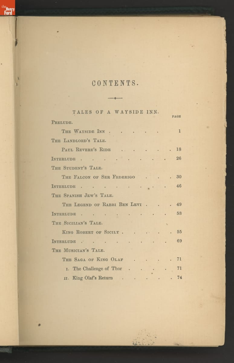 Henry Wadsworth Longfellow (1807-1882), the most beloved American poet of the 19th century, assembled a collection of his poetry into the book Tales of a Wayside Inn. It recounts tavern guests entertaining each other during a storm by telling stories. Longfellow blended new poems with his existing works--such as "Paul Revere's Ride"--in this book, first published in 1863.